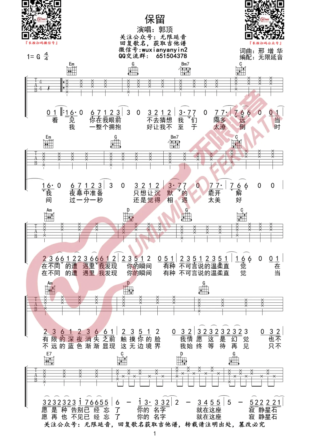 保留吉他谱_郭顶_《保留》G调弹唱六线谱...