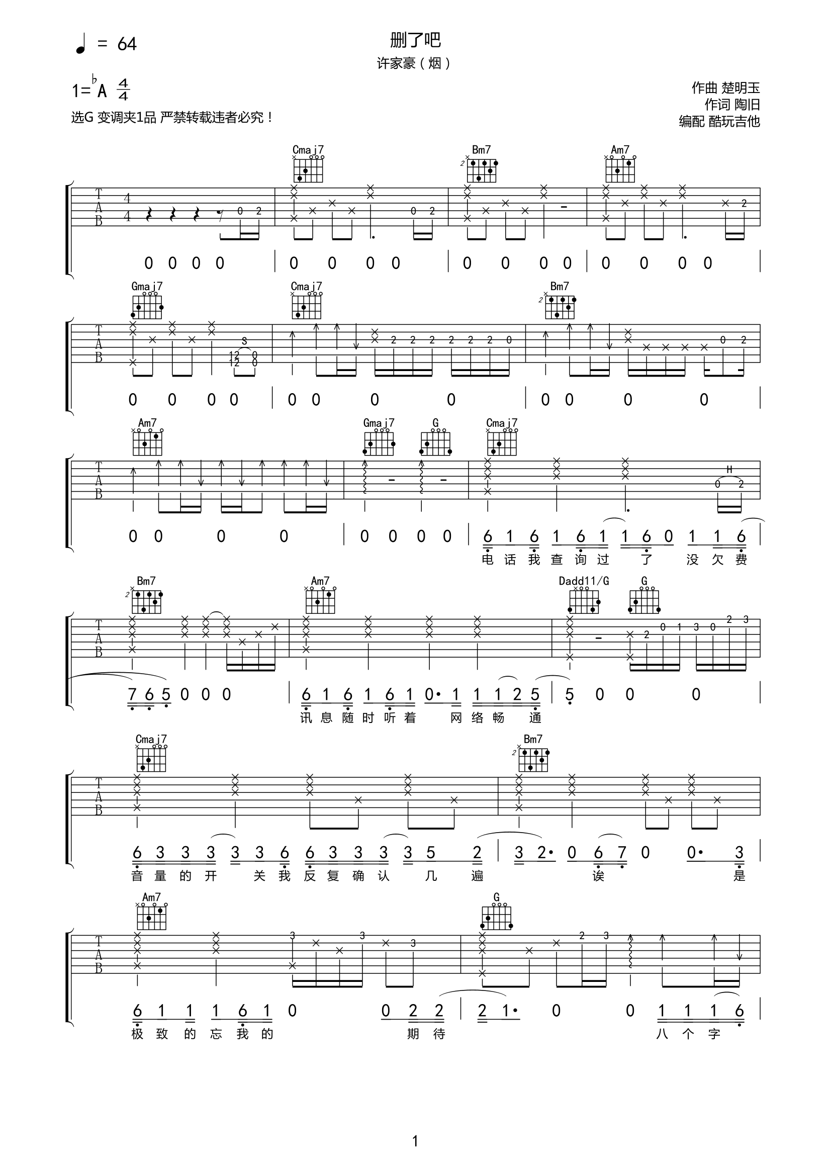 许佳豪(烟)《删了吧》吉他谱-G调原版弹唱谱...