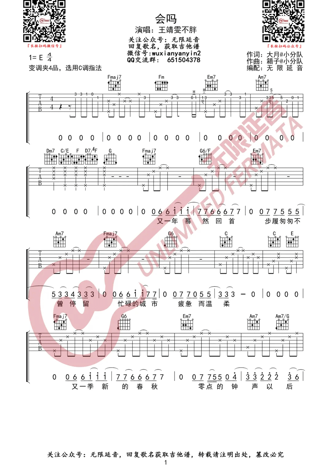 吉他会吗吉他谱_王靖雯不胖_《会吗》C调弹唱六线谱_高清图片谱分享
