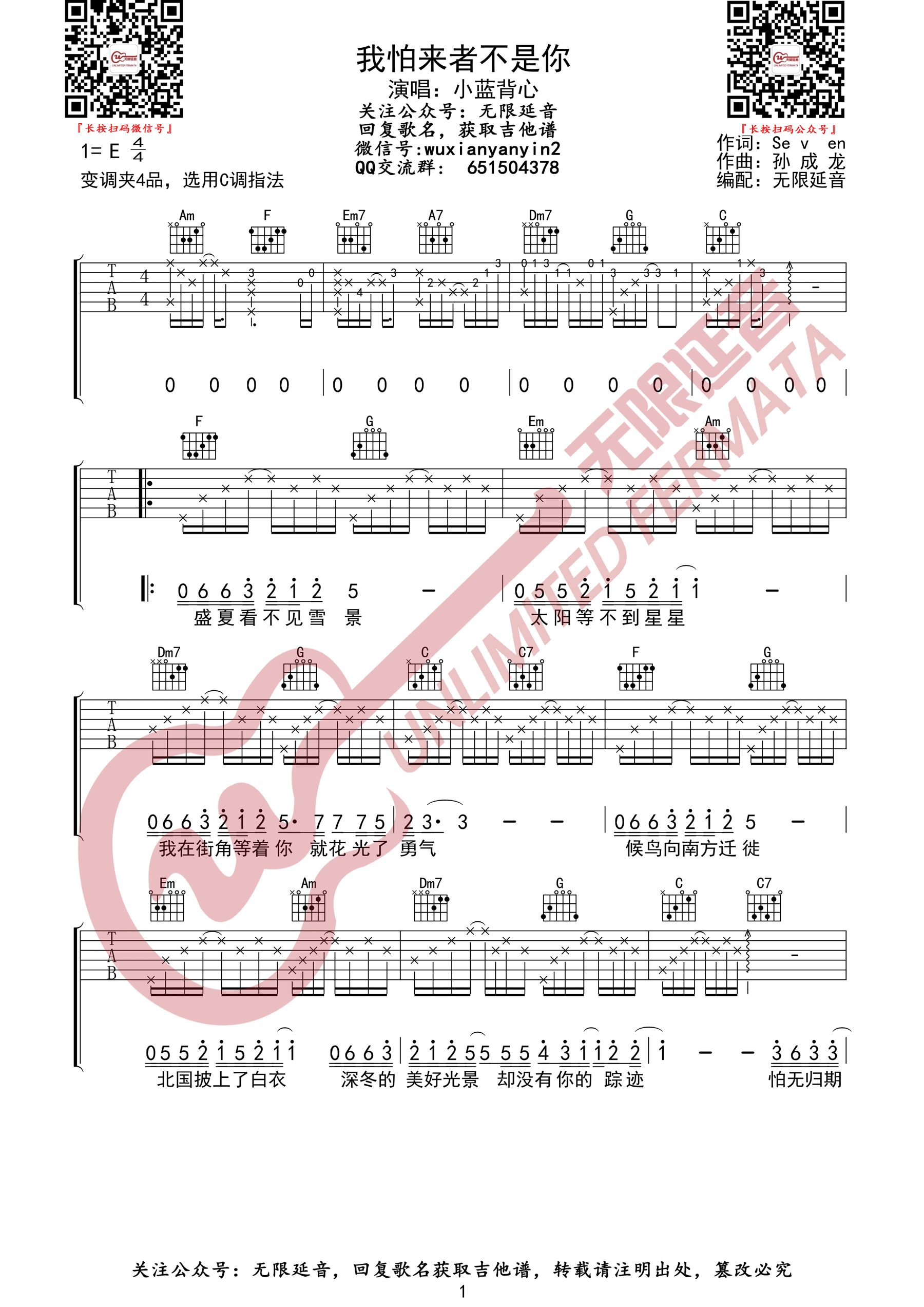 《我怕来者不是你》吉他谱_小蓝背心_C调原版弹唱谱_高清六线谱分...