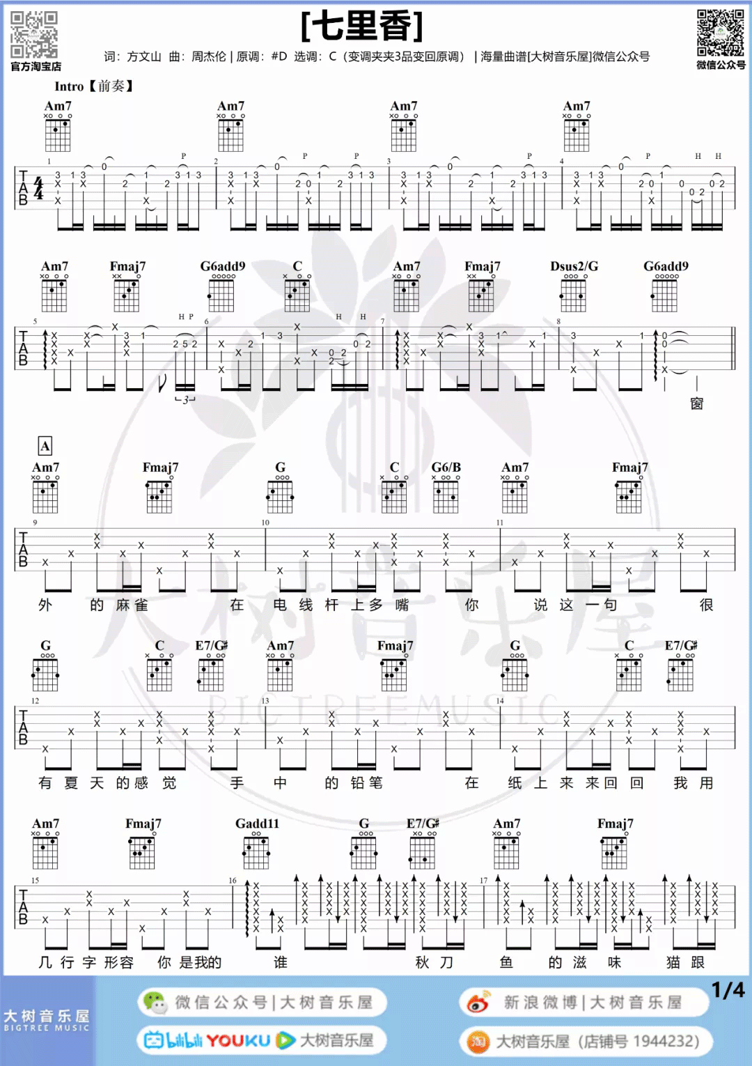 《七里香》吉他谱_周杰伦_C调原版六线谱...