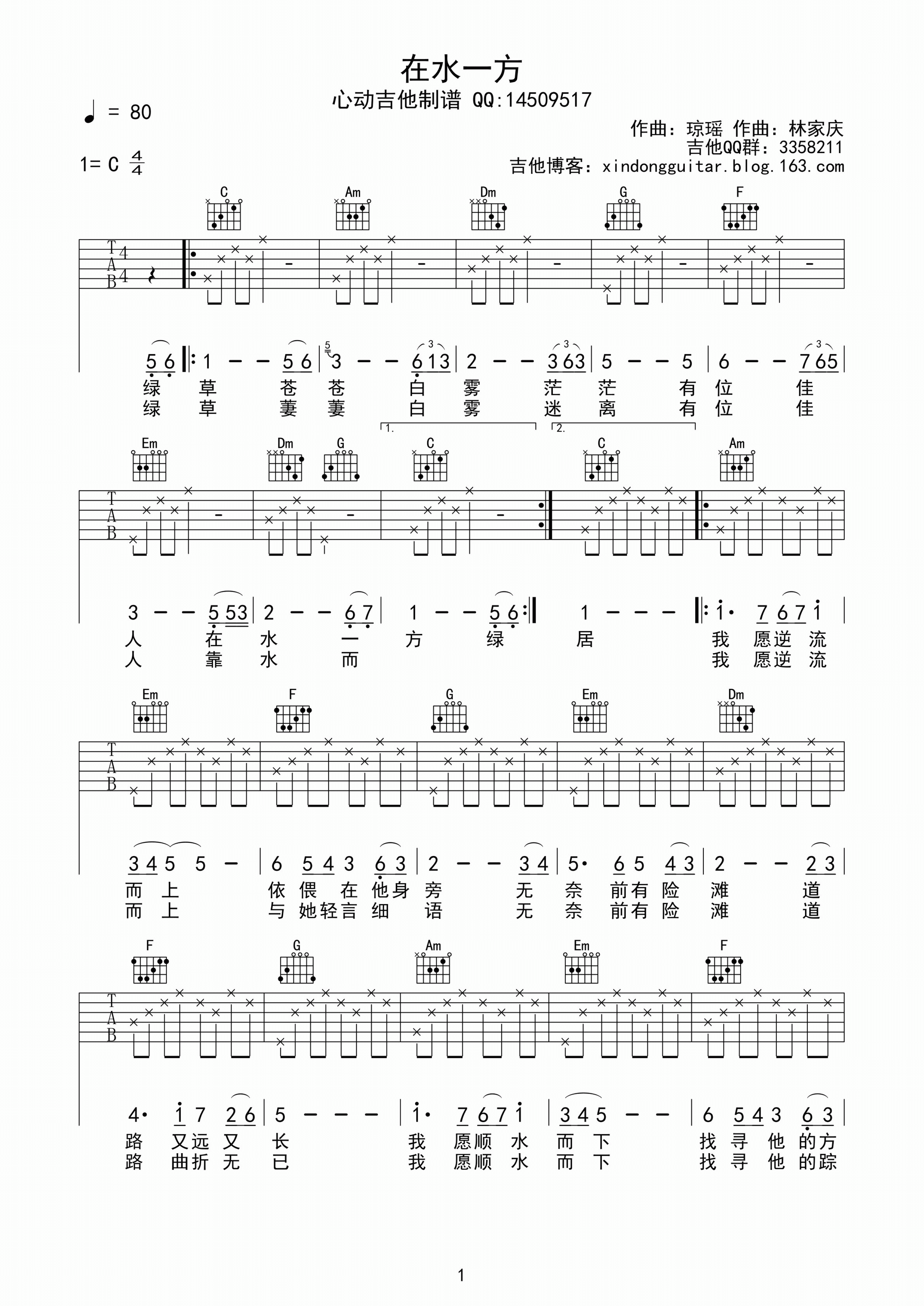 邓丽君《在水一方》吉他谱,采用C调指法编配,共有2张高清图谱,免翻页排版设计。...
