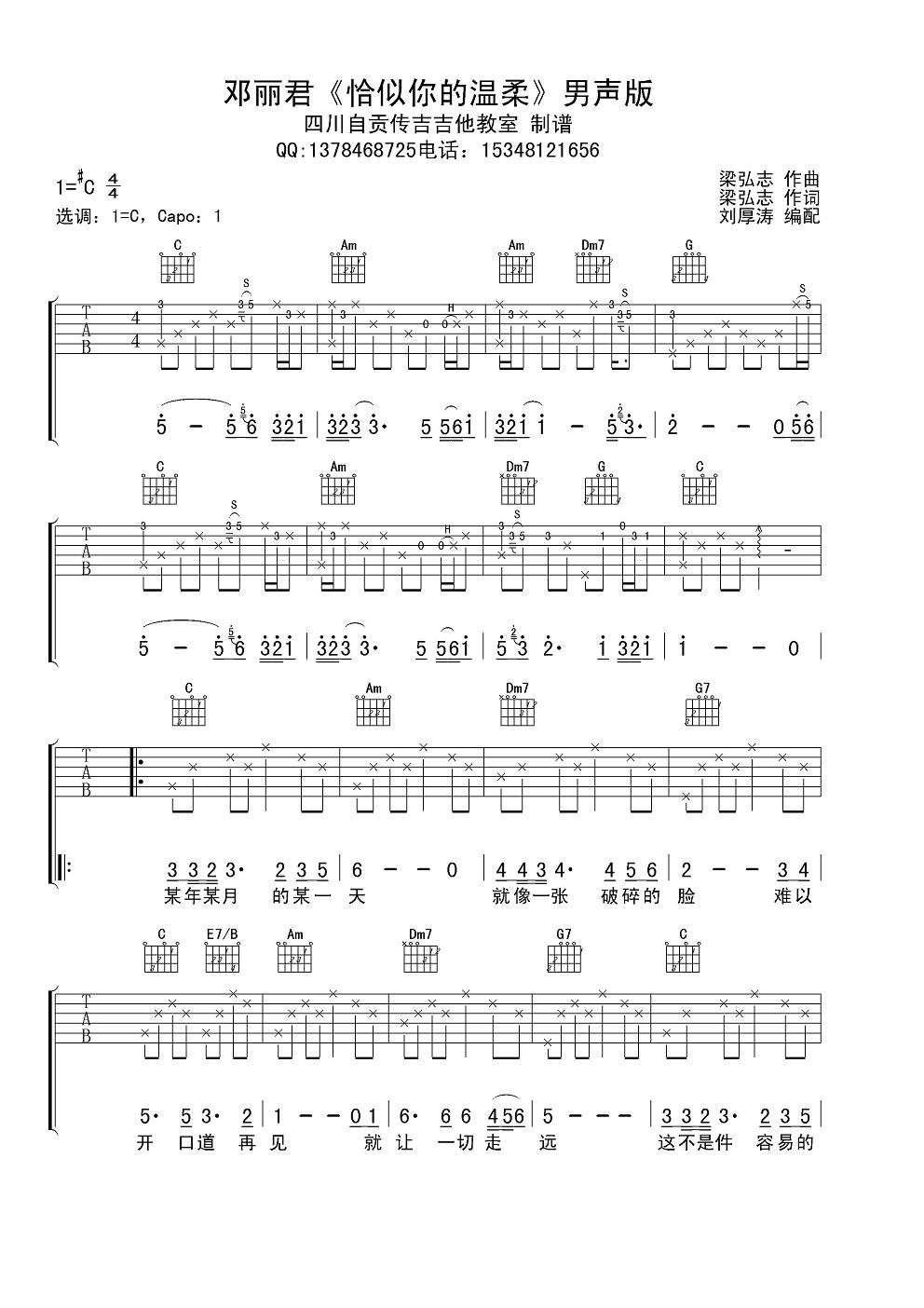 邓丽君《恰似你的温柔》吉他谱,采用C#调指法编配,共有3张高清图谱。...