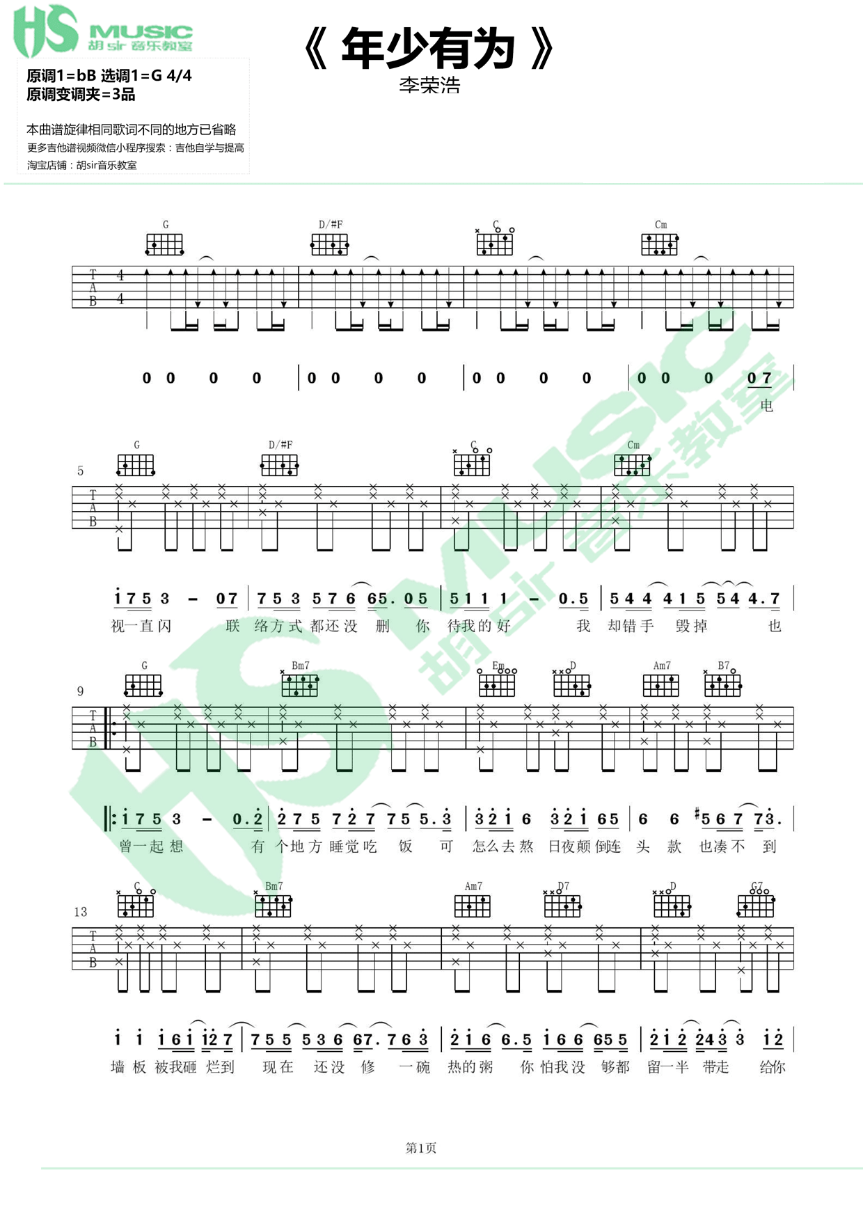 李荣浩《年少有为》吉他谱,采用G调指法编配,共有2张高清图谱,免翻页排版设计。...