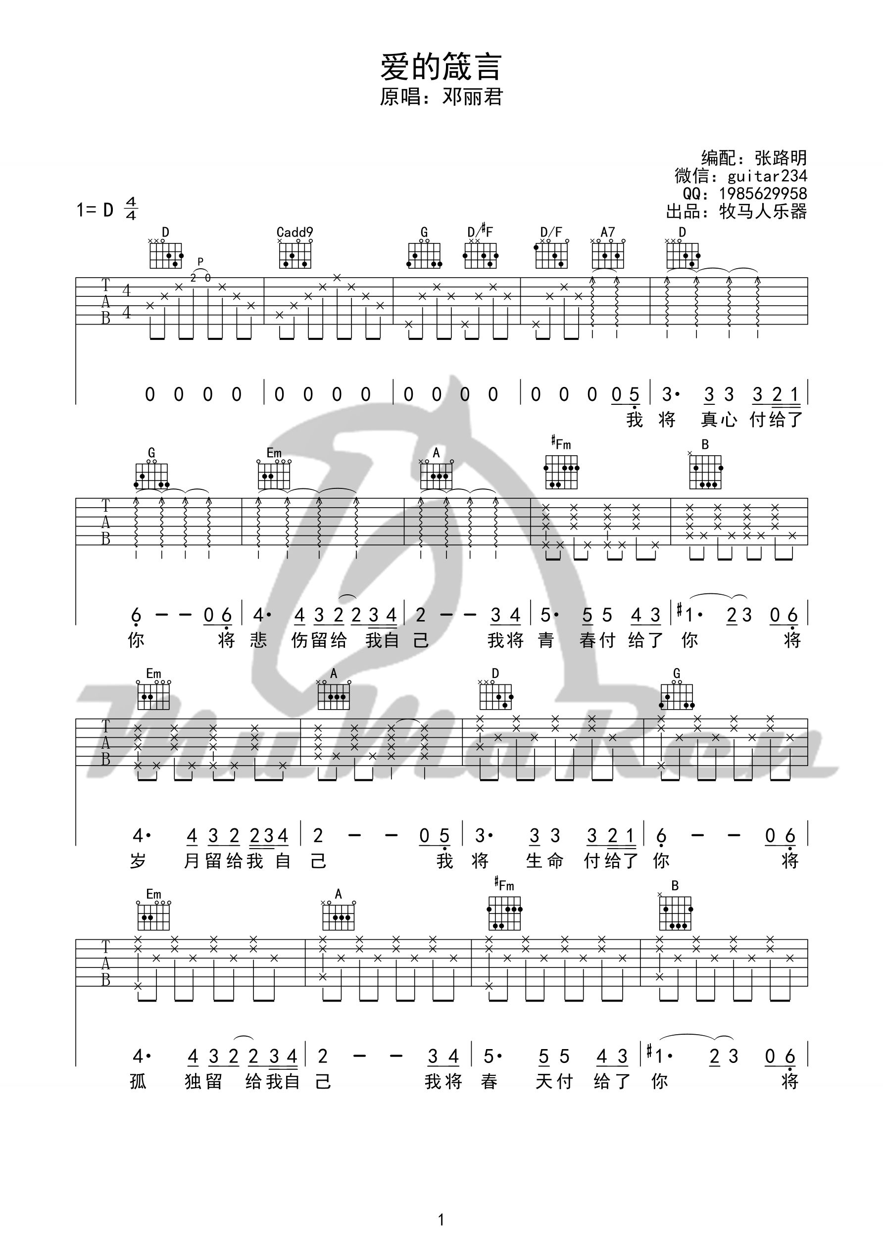 邓丽君《爱的箴言》吉他谱,采用D调指法编配,共有3张高清图谱。...