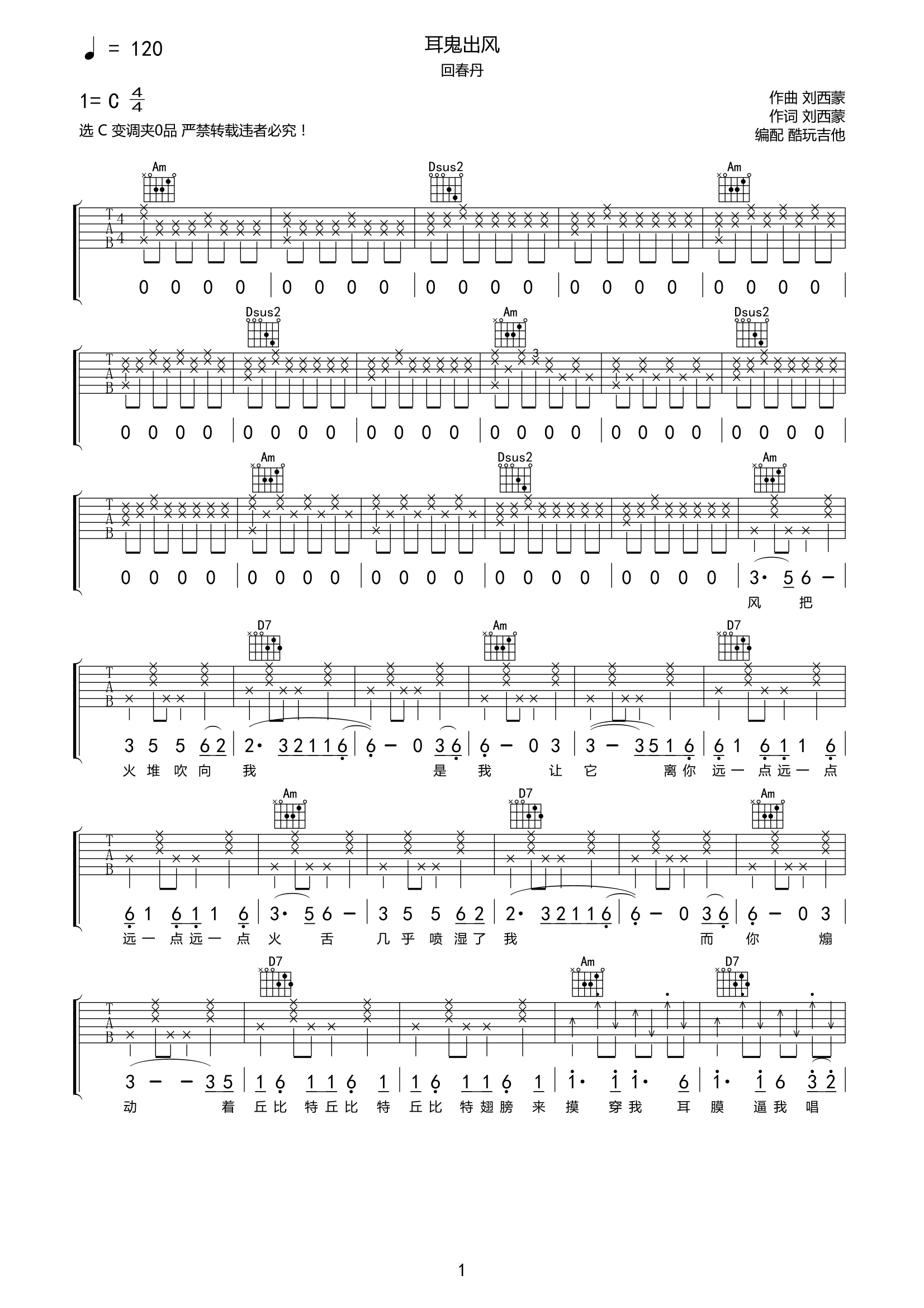 回春丹《耳鬼出风》吉他谱-C调弹唱谱...