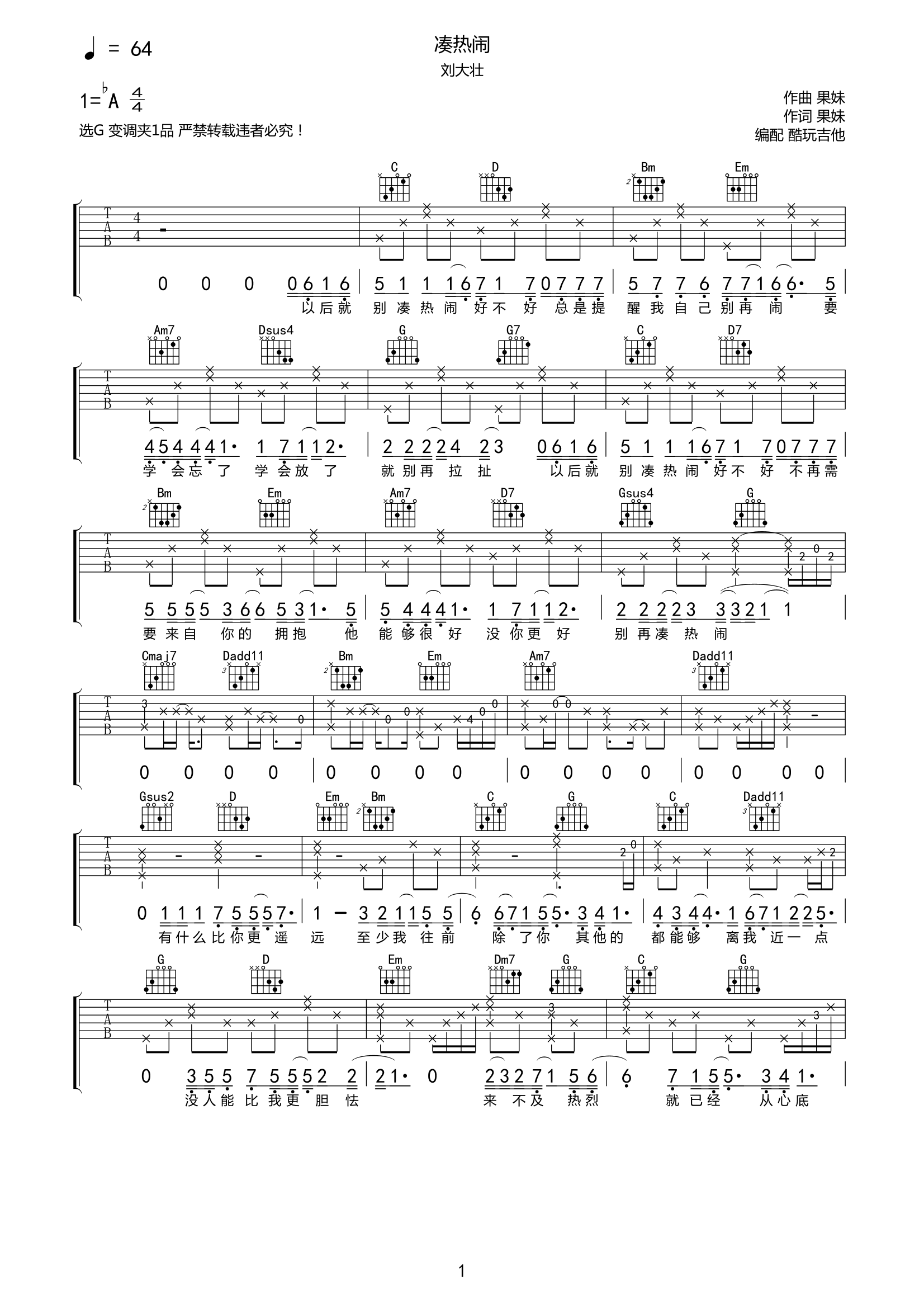 刘大壮《凑热闹》吉他谱-G调弹唱谱高清六线谱...