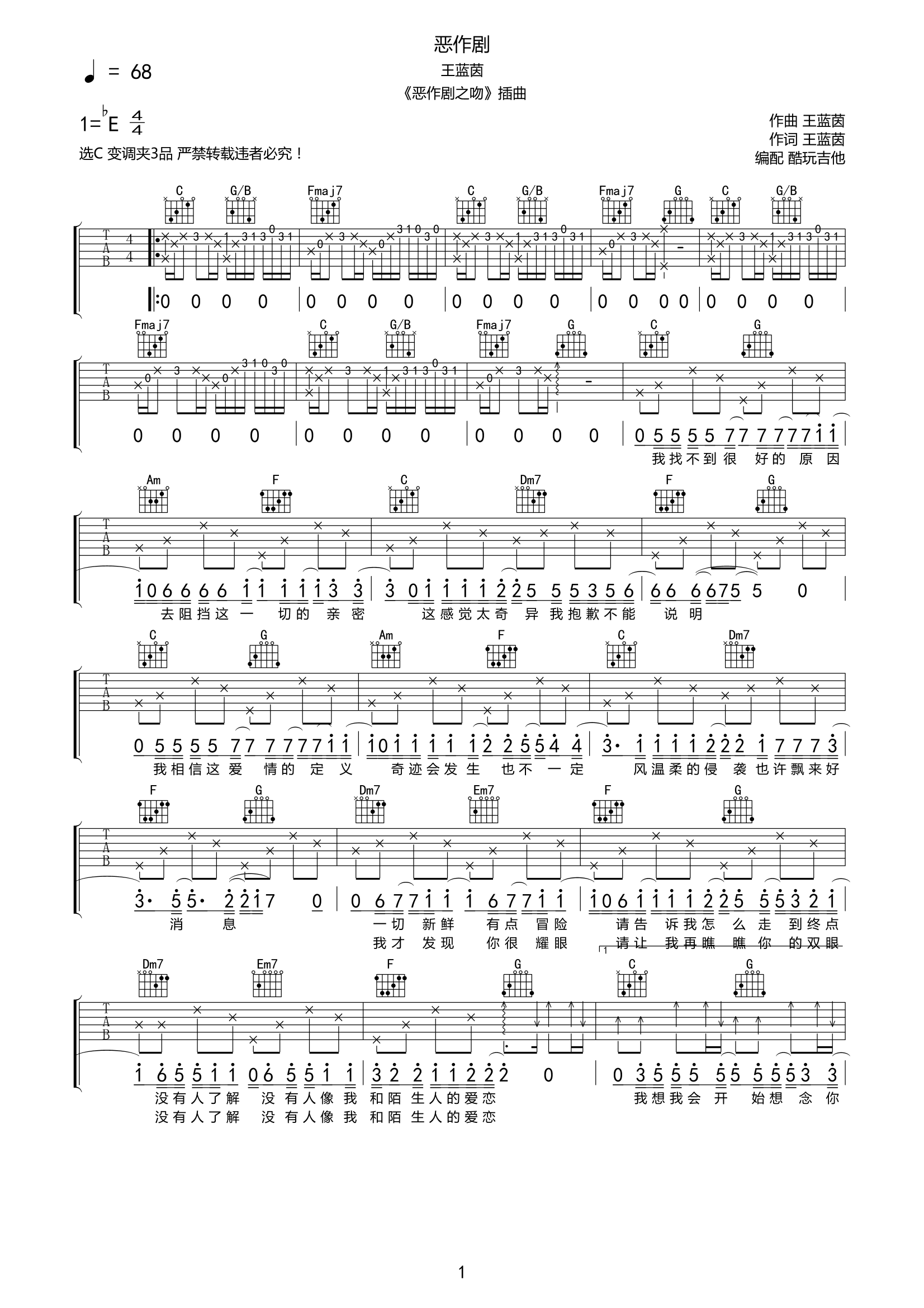 王蓝茵《恶作剧》吉他谱恶作剧主题曲-C调弹唱谱...
