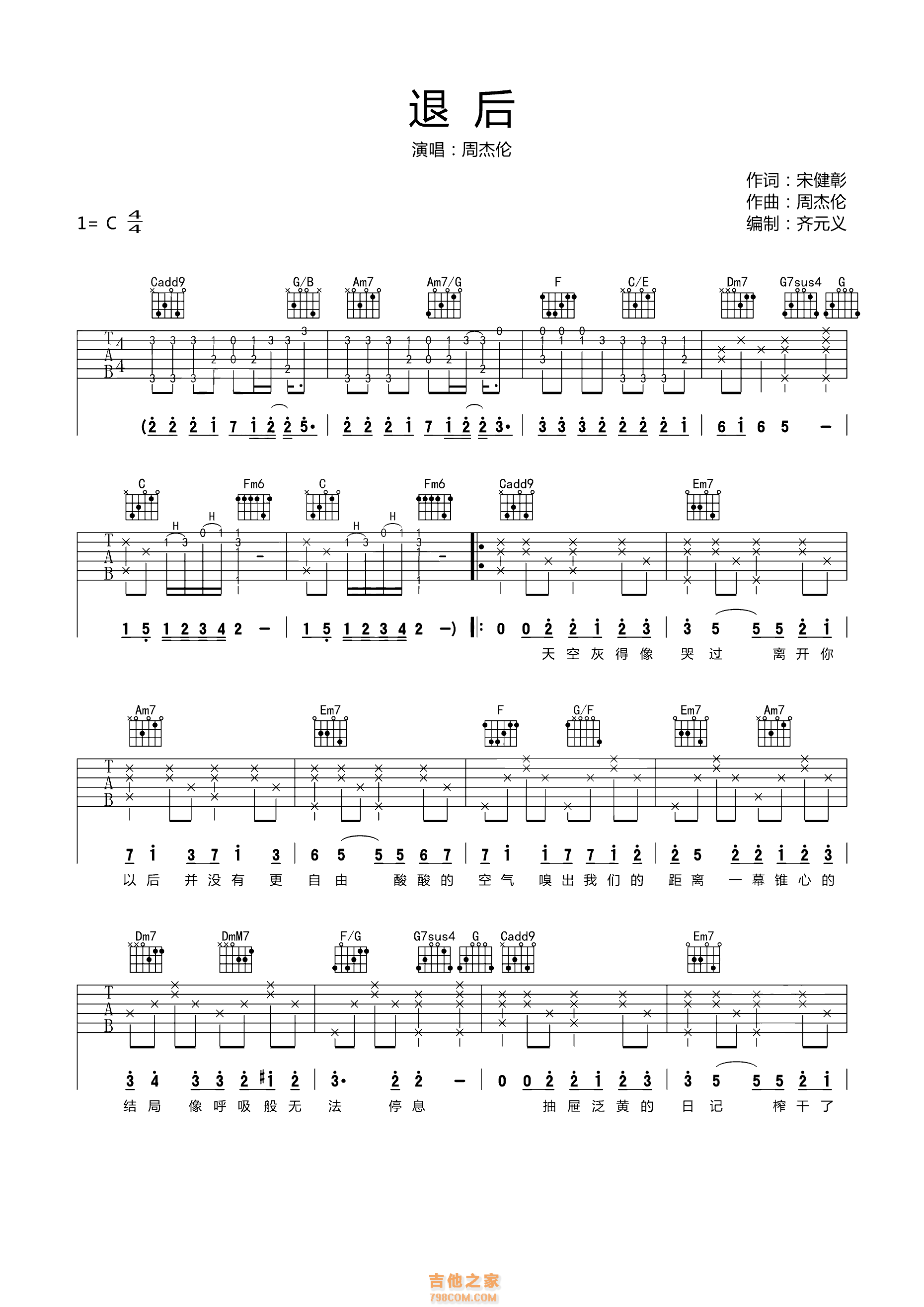 周杰伦《退后》吉他谱,采用C调指法编配,共有3张高清图谱。...