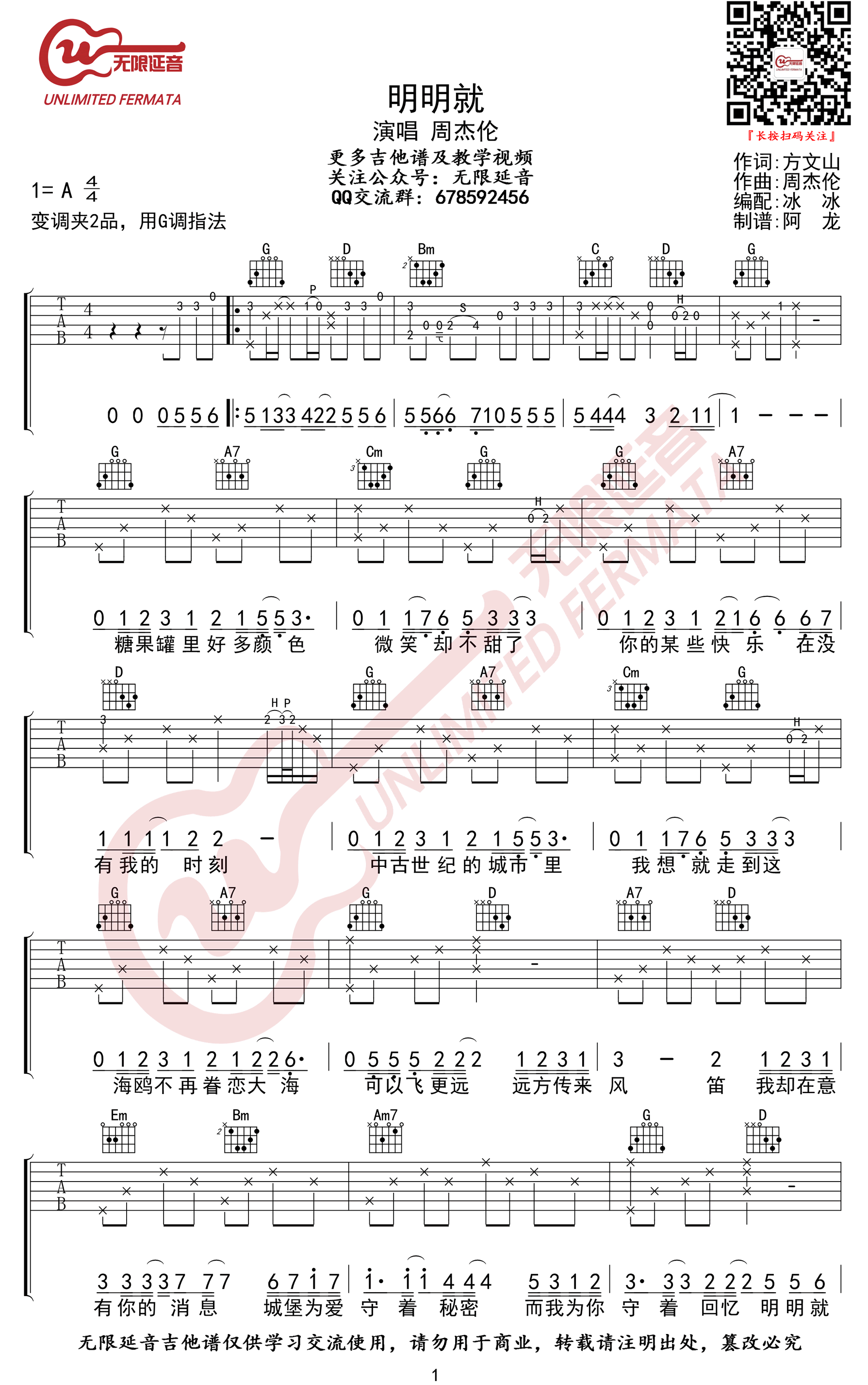 周杰伦《明明就》吉他谱,采用G调指法编配,共有2张高清图谱,免翻页排版设计。...