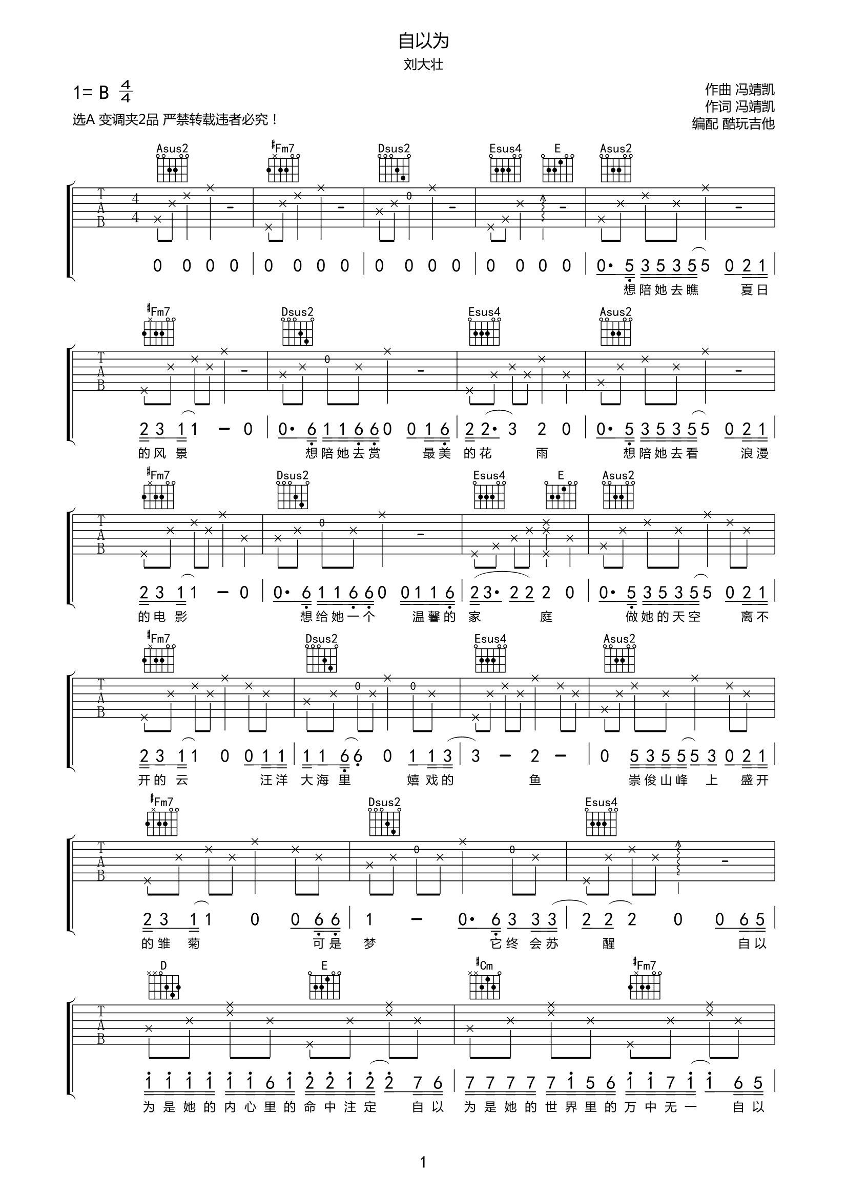 刘大壮《自以为》吉他谱-A调弹唱谱高清六线谱...