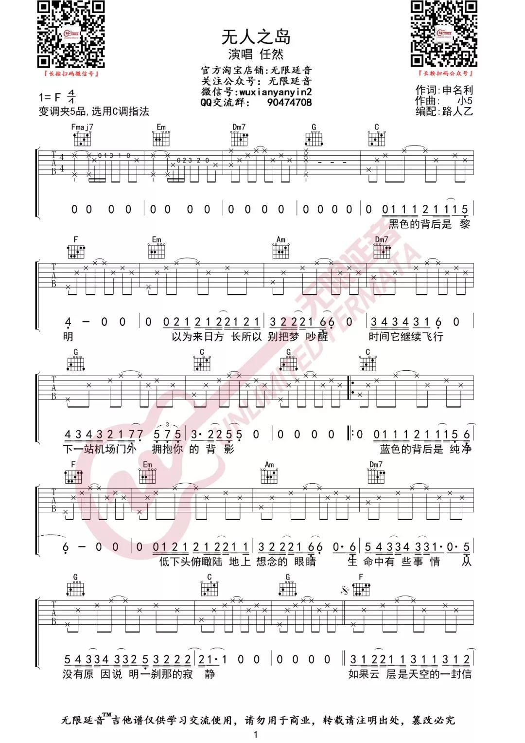 任然《无人之岛》吉他谱,采用C调指法编配,共有2张高清图谱,免翻页排版设计。...
