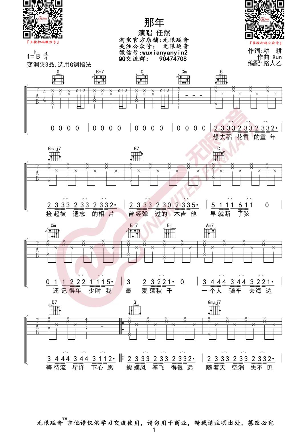 任然《那年》吉他谱,采用G调指法编配,共有3张高清图谱。...