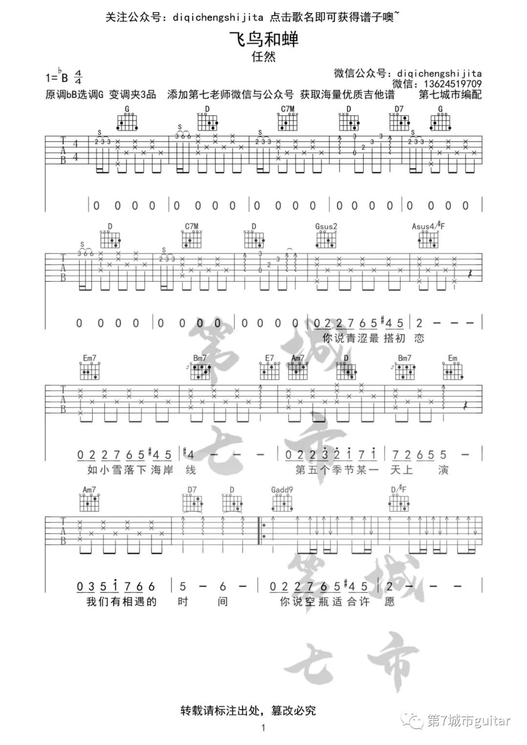 任然《飞鸟和蝉》吉他谱,采用G调指法编配,共有3张高清图谱。...