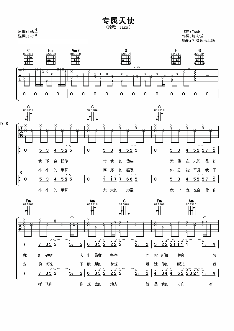 tank《专属天使》吉他谱,采用C调指法编配,共有3张高清图谱。...