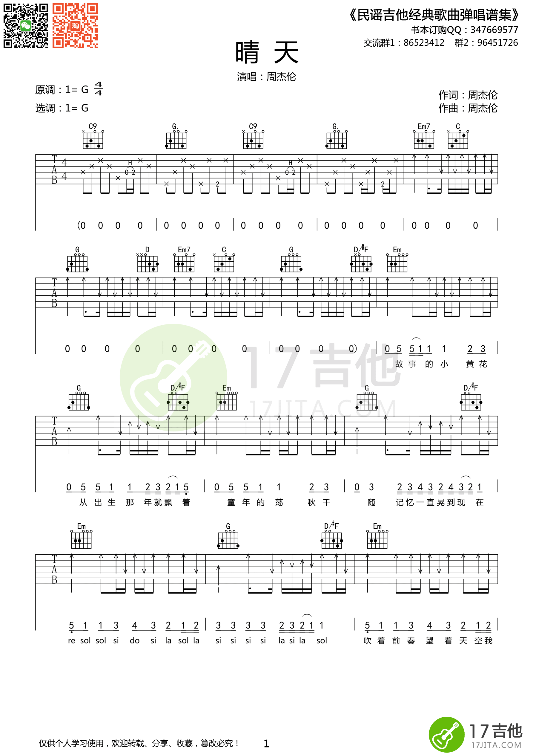 周杰伦《晴天》吉他谱,采用G调指法编配,共有3张高清图谱。...