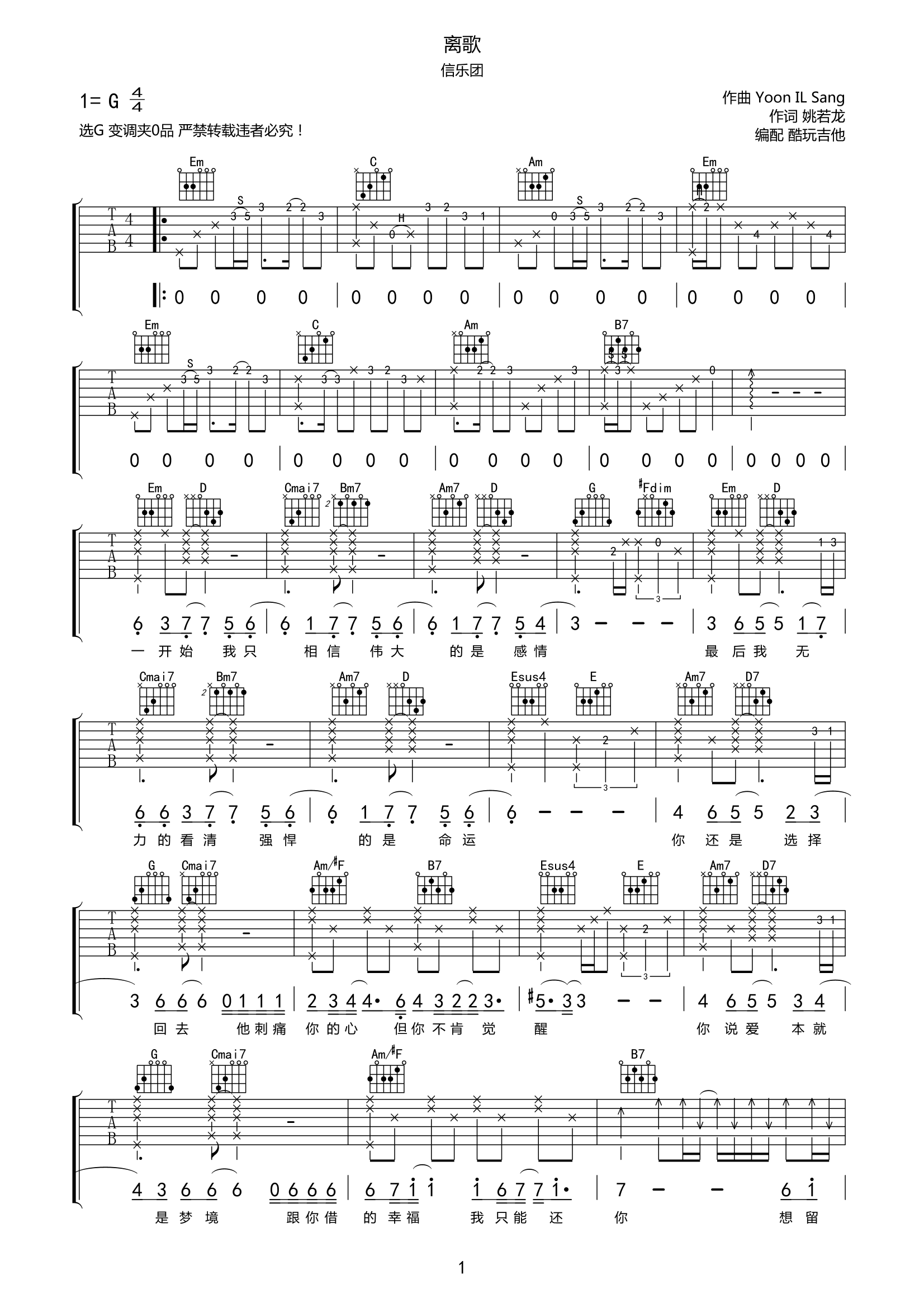 吉他信乐团《离歌》吉他谱原版-G调弹唱谱