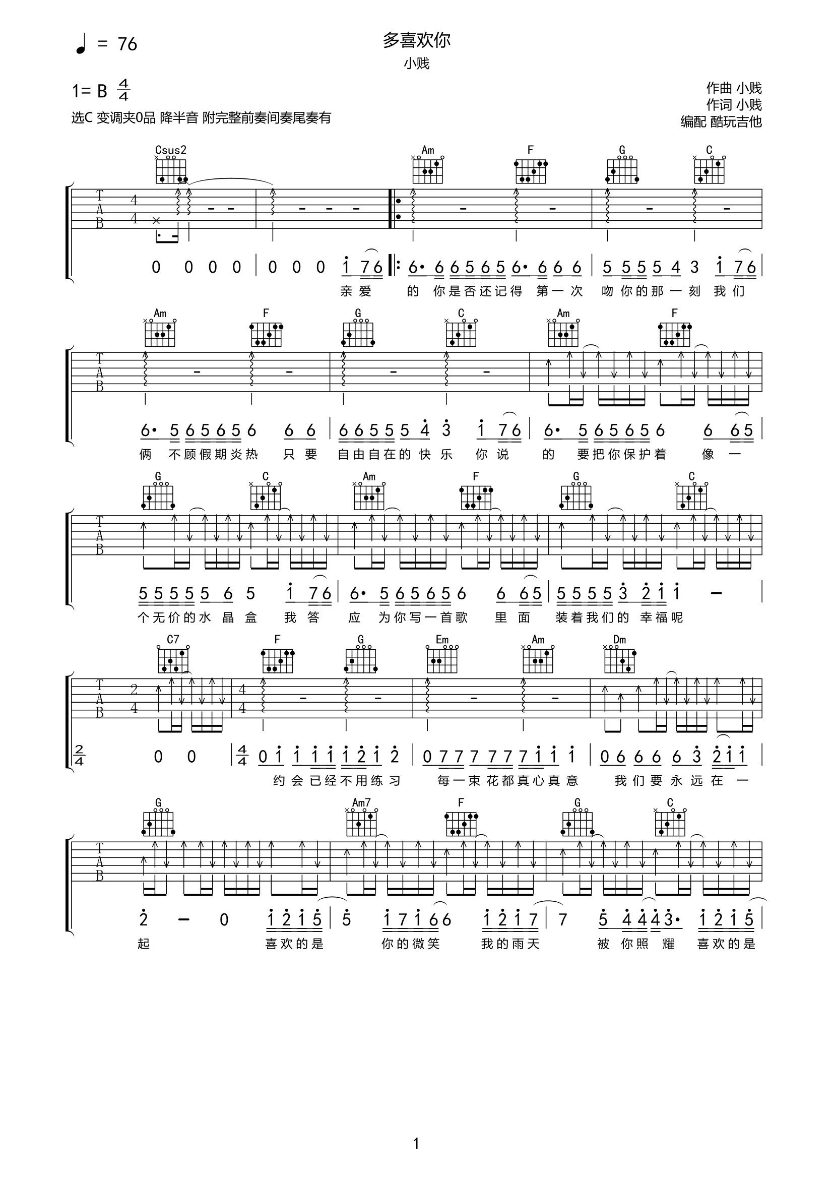 小贱《多喜欢你》吉他谱-C调弹唱谱附完整前奏间奏尾奏降半音可忽略...