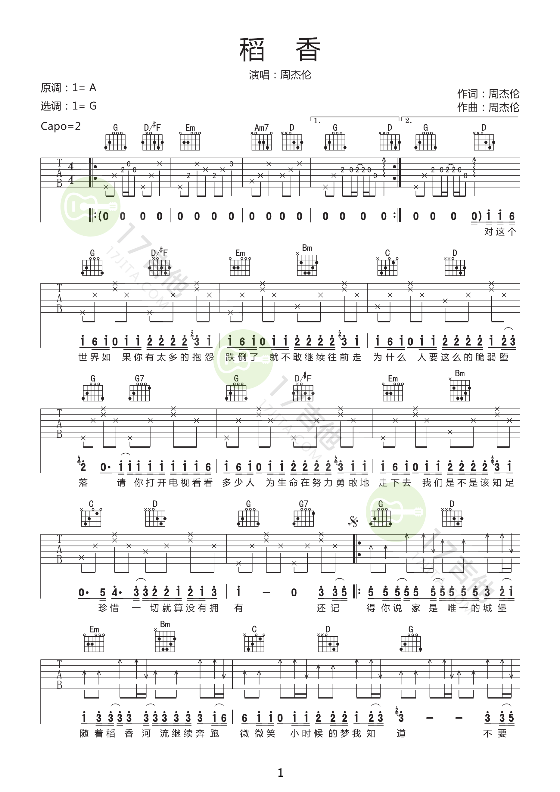 吉他周杰伦《稻香》G调原版弹唱吉他六线谱_高清图片谱