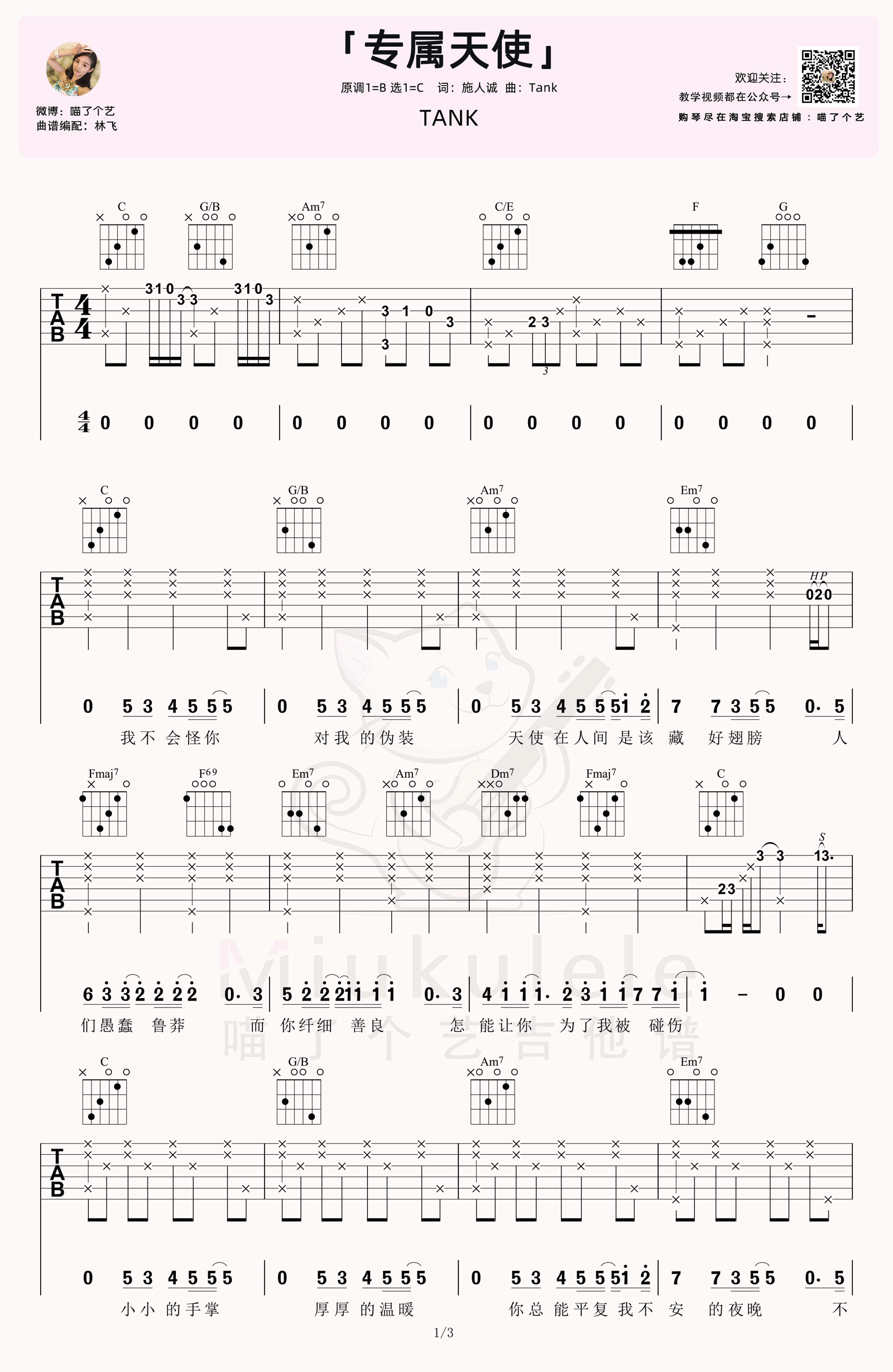 吉他Tank《专属天使》吉他谱 C调原版弹唱六线谱