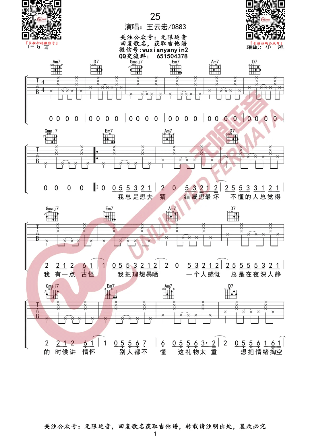 吉他王云宏/0883《25》G调弹唱六线谱