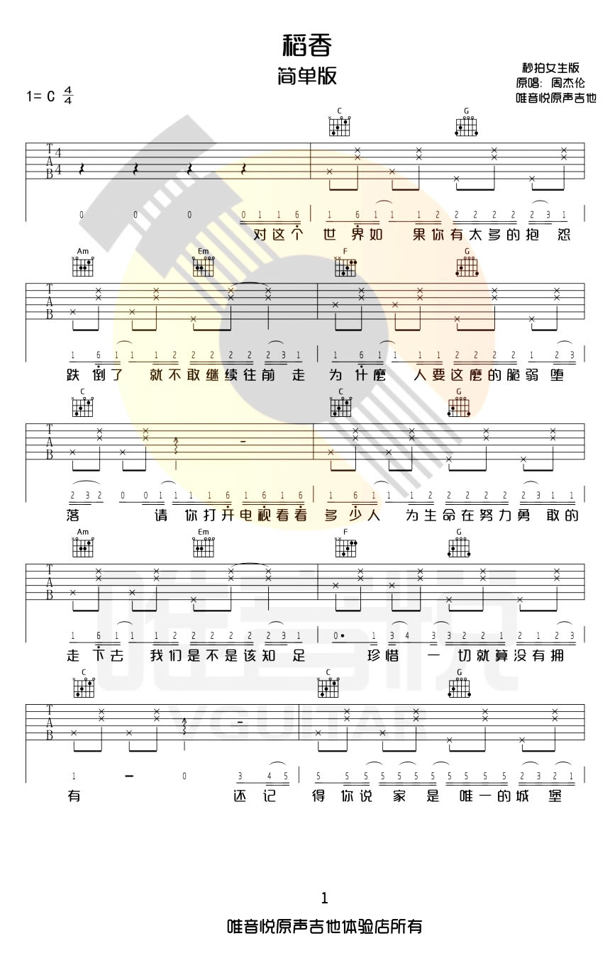 周杰伦《稻香》C调超简单女生版弹唱吉他六线谱...