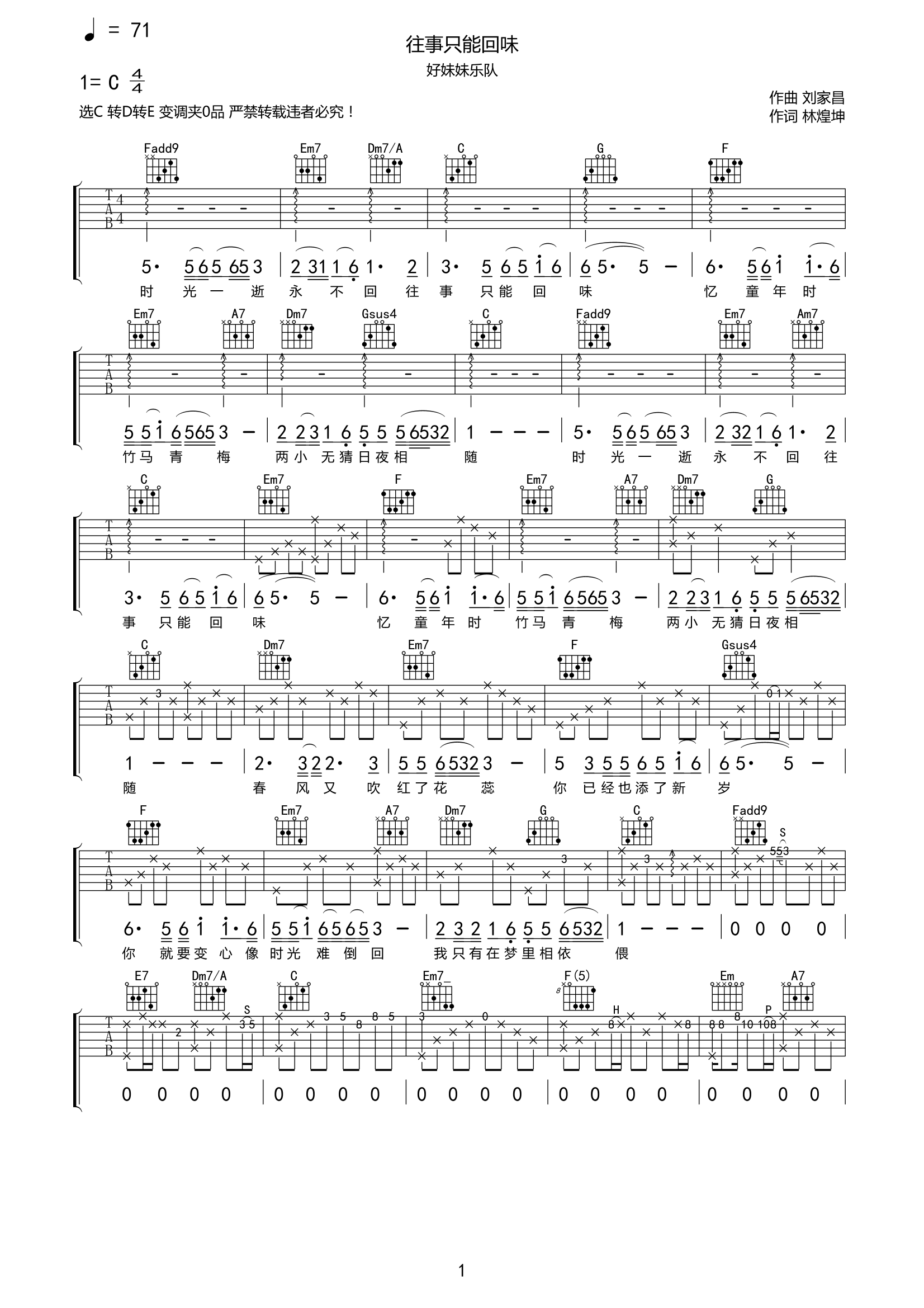 好妹妹《往事只能回味》吉他谱-C调弹唱谱高清六线谱...