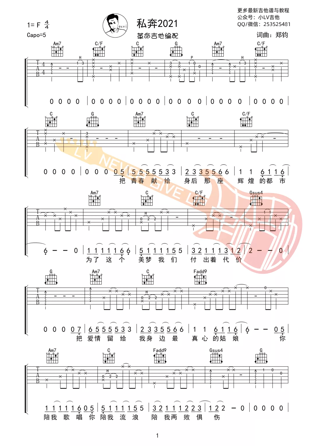 郑钧《私奔》吉他谱C调弹唱六线谱...