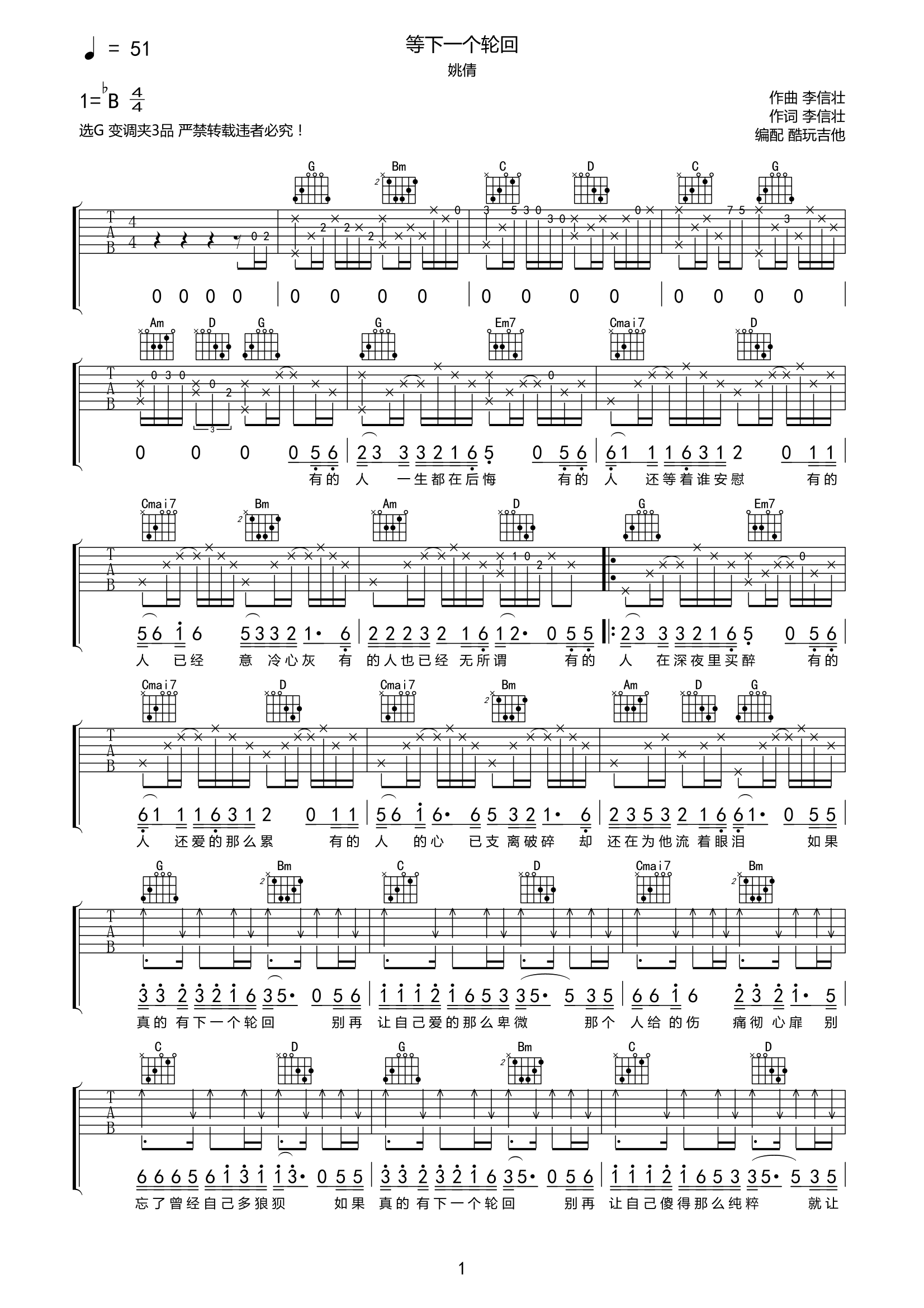 吉他姚倩《等下一个轮回》吉他谱-G调弹唱谱高清六线谱