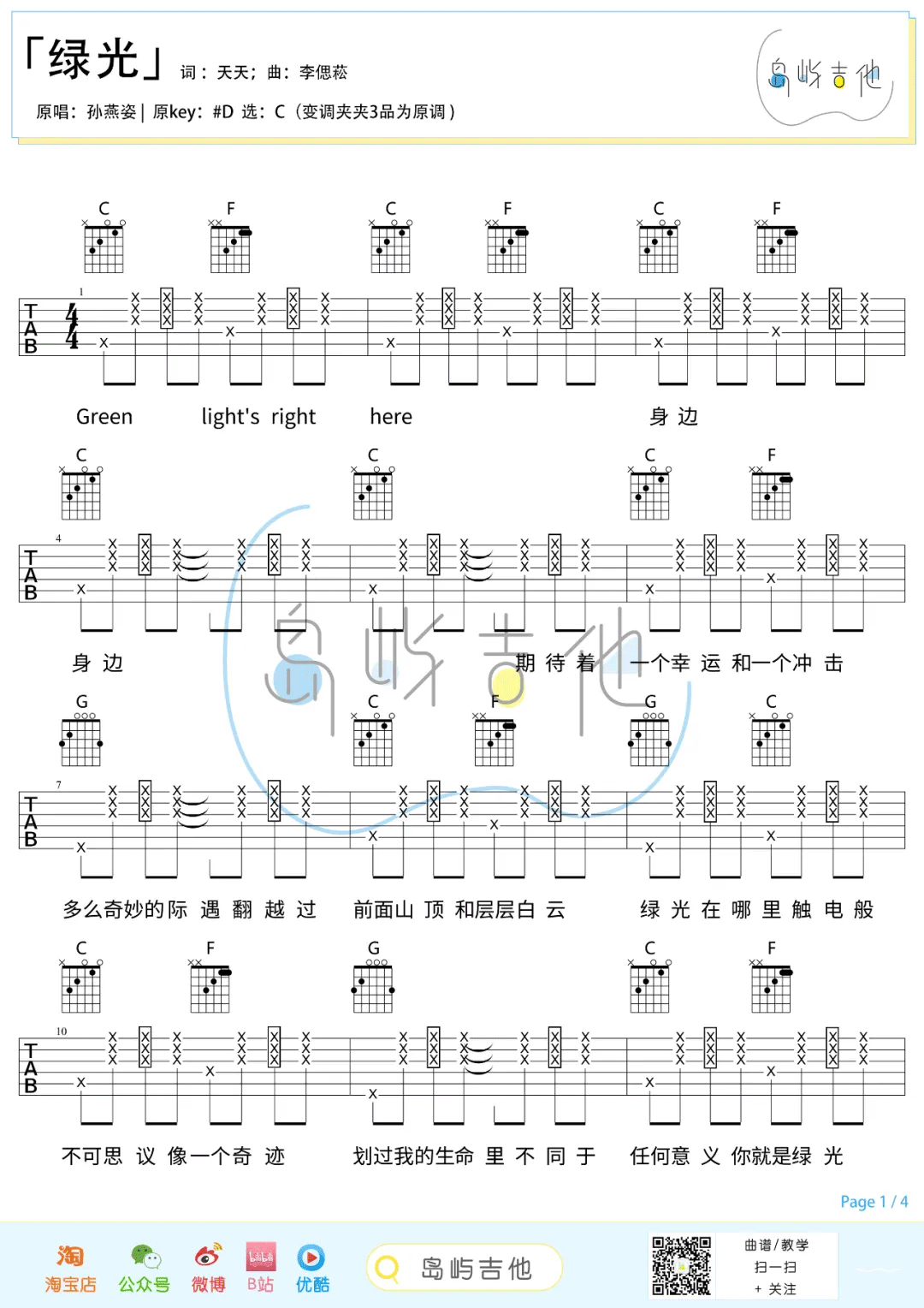 吉他孙燕姿_《绿光》C调弹唱六线谱