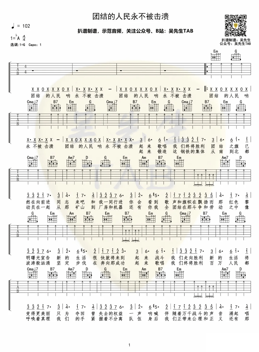 吉他《团结的人民永不被击溃》吉他谱_中文版_G调高清弹唱六线谱