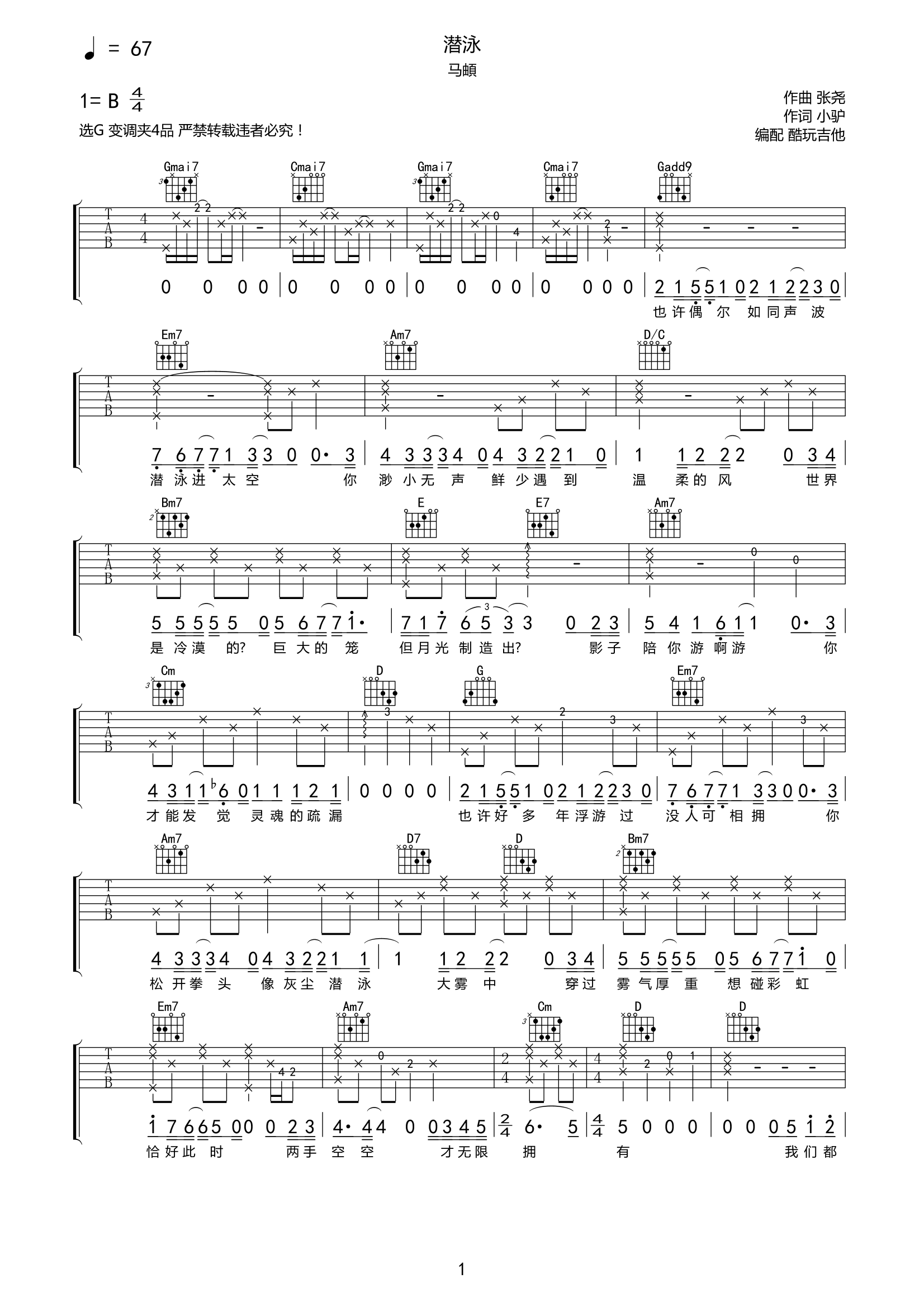 吉他马頔《潜泳》吉他谱-G调弹唱谱高清六线谱
