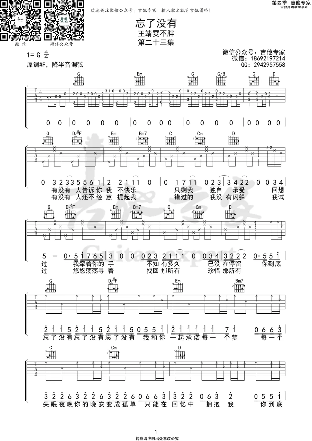 王靖雯不胖《忘了没有》吉他谱G调弹唱谱...