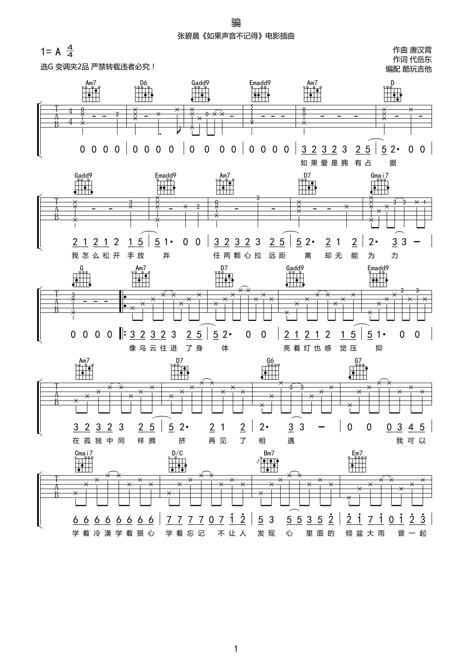 张碧晨《骗》吉他谱-G调弹唱谱高清六线谱...
