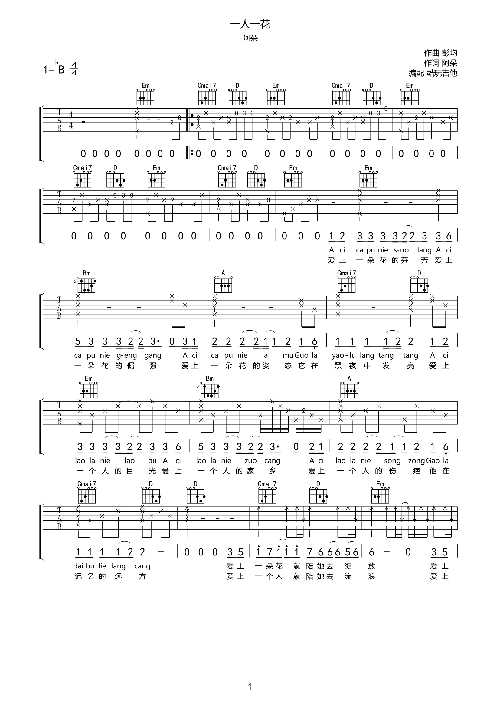 吉他阿朵《一人一花》吉他谱-G调弹唱谱高清六线谱