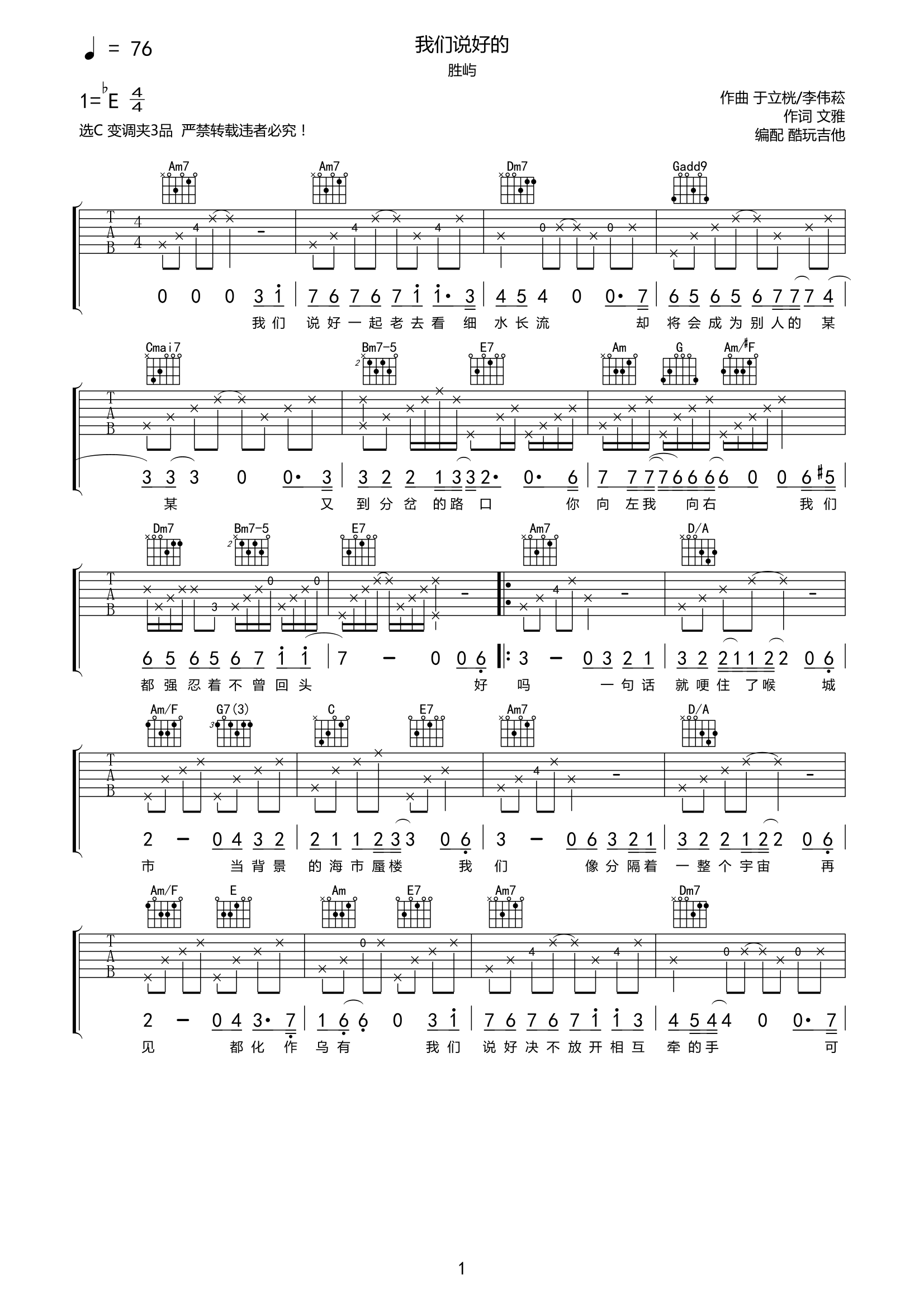 吉他胜屿《我们说好的》吉他谱-C调弹唱谱高清六线谱