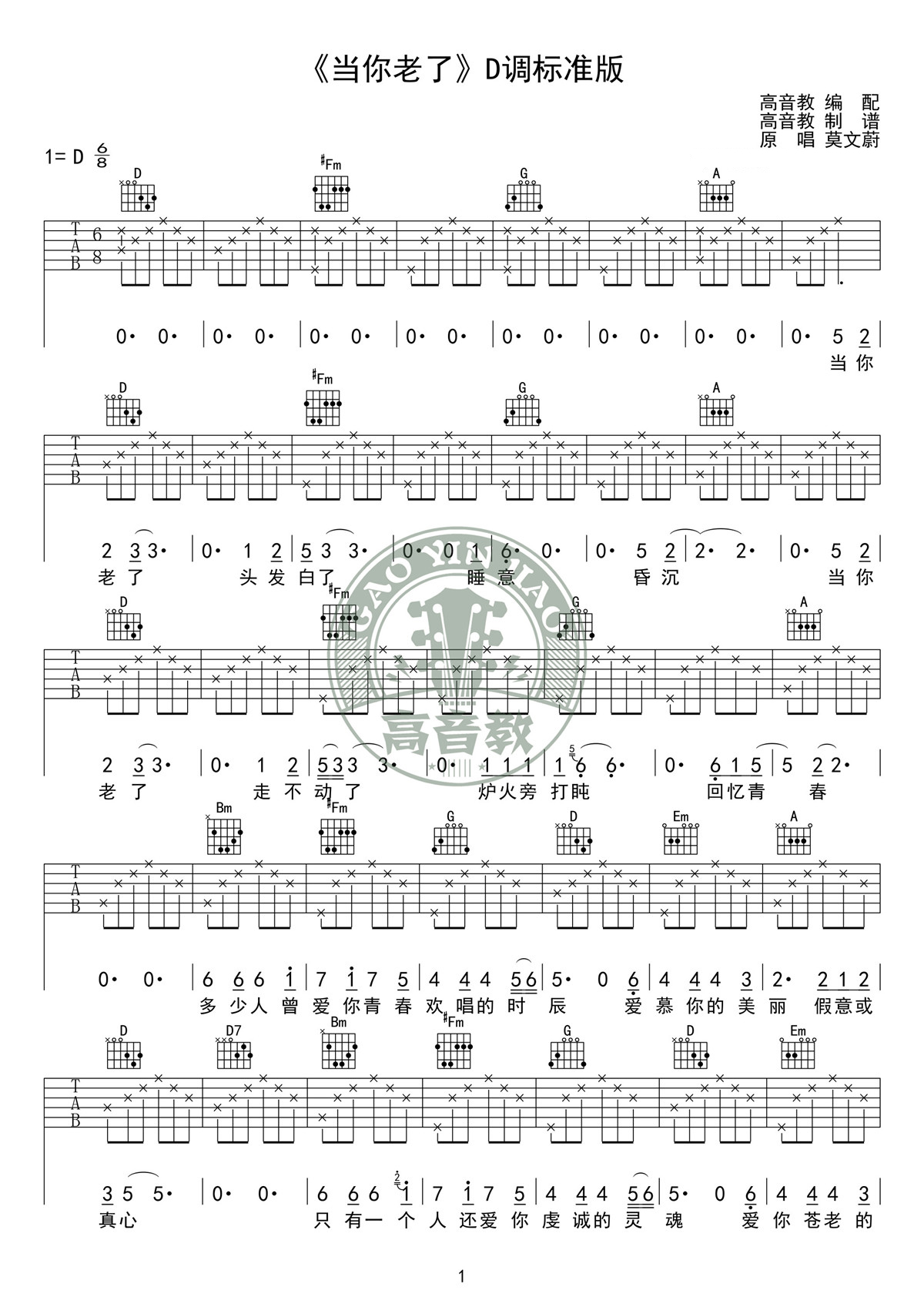 吉他莫文蔚《当你老了》D调高清弹唱吉他六线谱_女生版