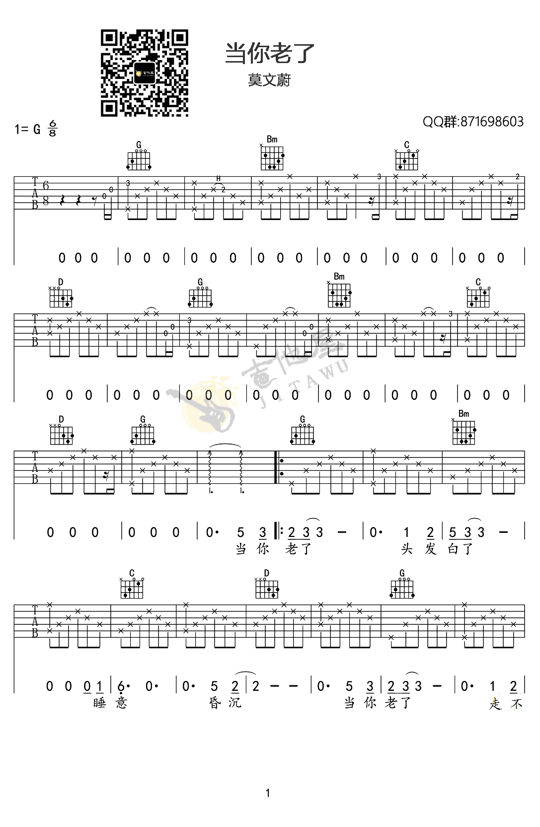 莫文蔚《当你老了》G调弹唱吉他六线谱_图片谱_女生版...