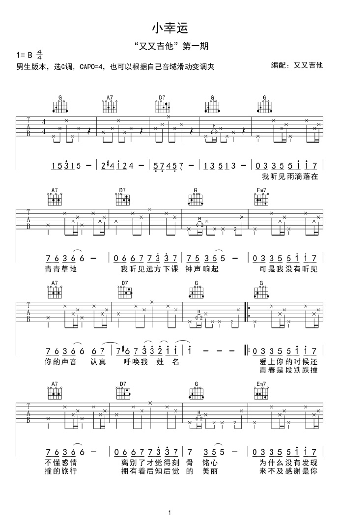 吉他田馥甄《小幸运》G调高清吉他弹唱六线谱_男生版
