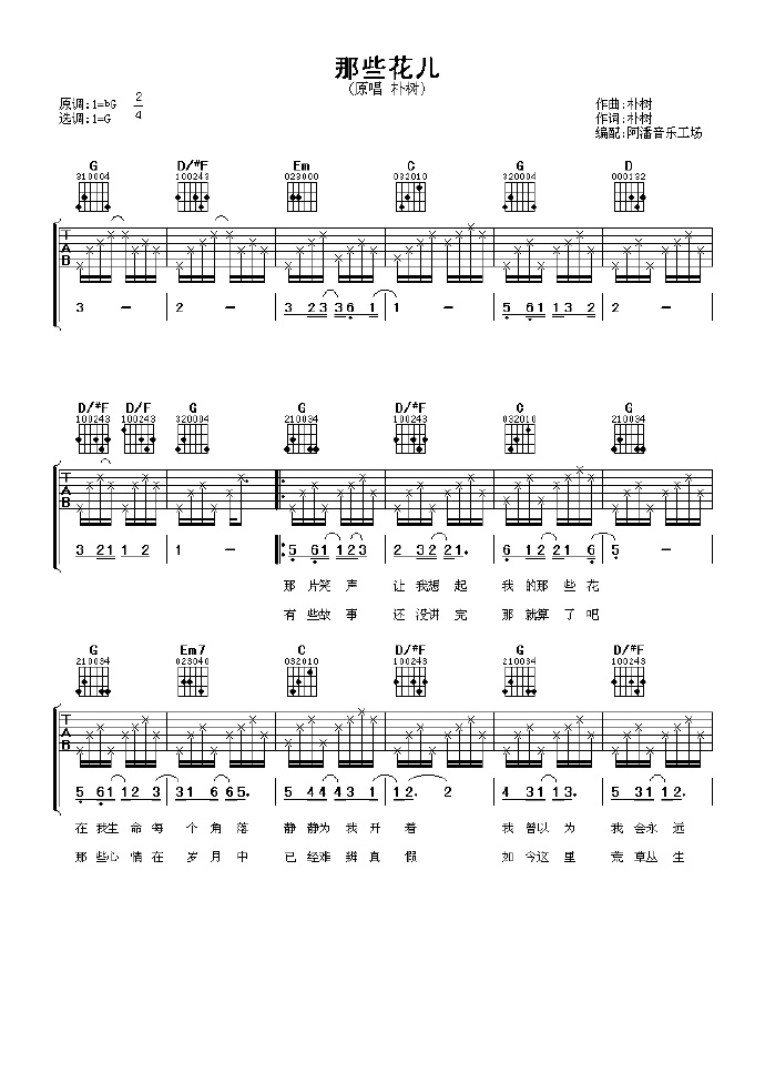 朴树《那些花儿》G调原版弹唱吉他谱_男生版...