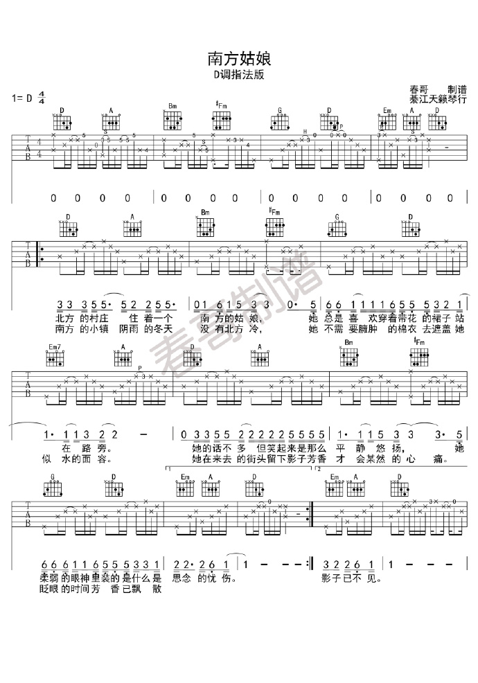 赵雷《南方姑娘》D调原版图片吉他谱_带前奏...