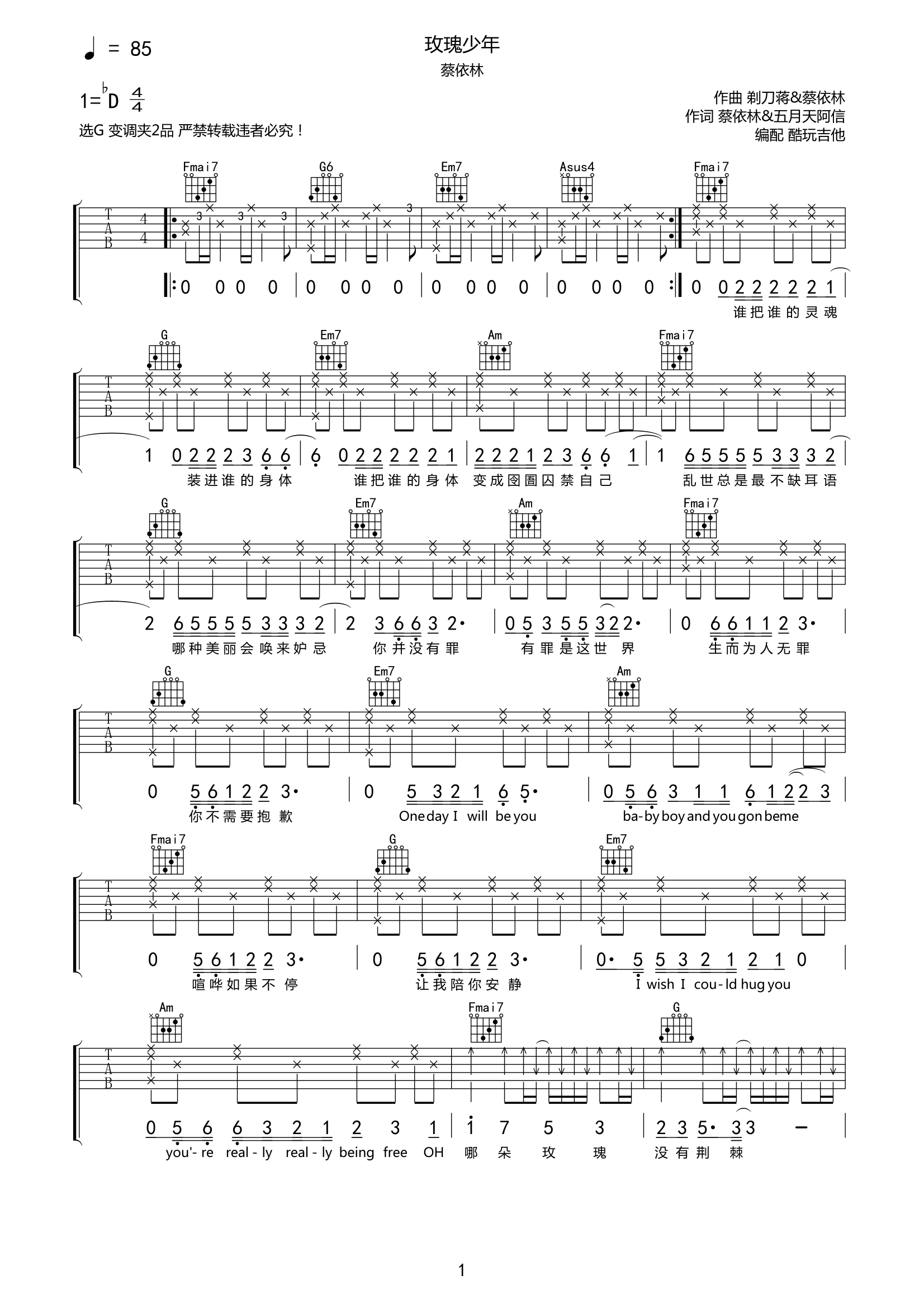 吉他蔡依林《玫瑰少年》吉他谱-C调弹唱谱高清六线谱