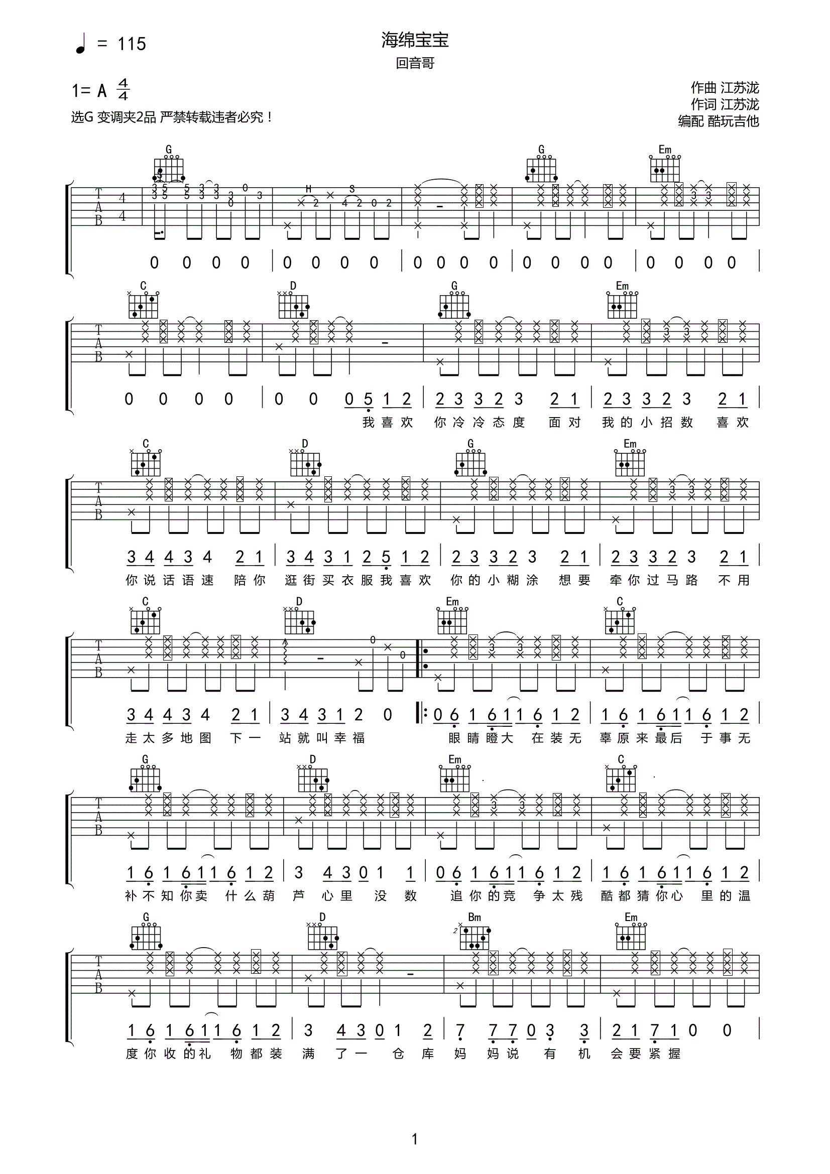 回音哥《海绵宝宝》吉他谱-G调弹唱谱高清六线谱...
