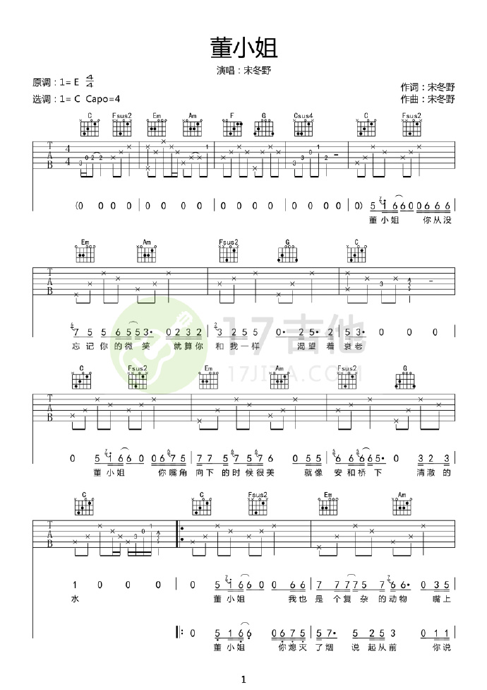 吉他宋冬野《董小姐》C调民谣弹唱吉他谱