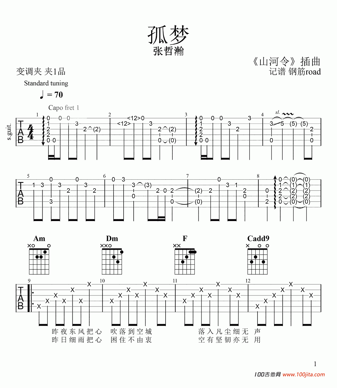 吉他孤梦吉他谱_张哲瀚_C调吉他弹唱谱山河令吉他谱