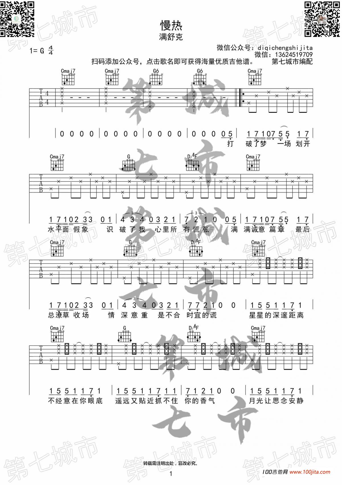 满舒克《慢热》吉他谱,采用G调指法编配,共有2张高清图谱,免翻页排版设计。...