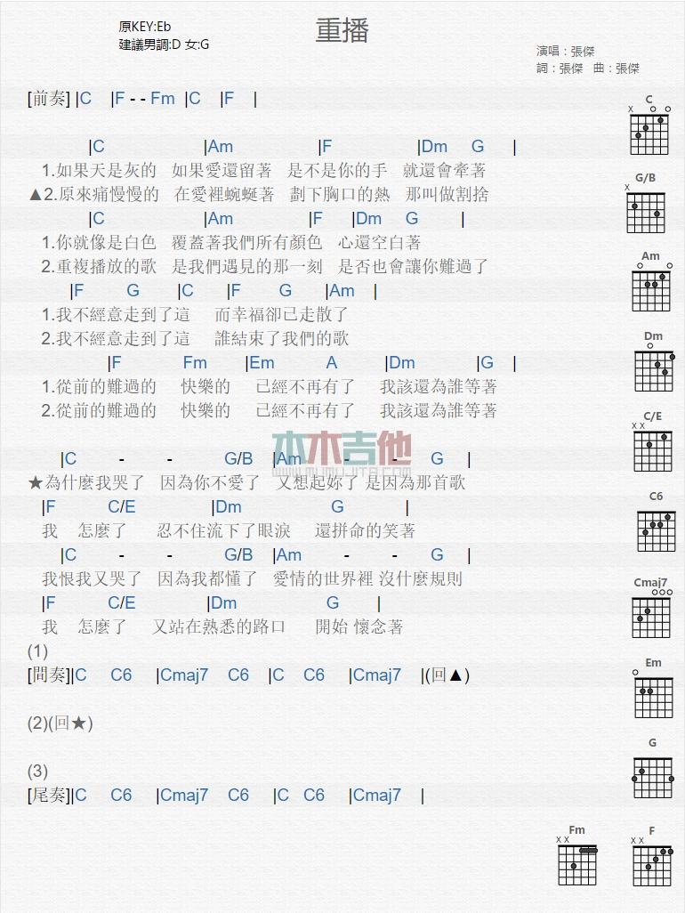 AJ张杰《重播_》吉他谱,采用D调指法编配,共有1张高清图谱,免翻页排版设计。...
