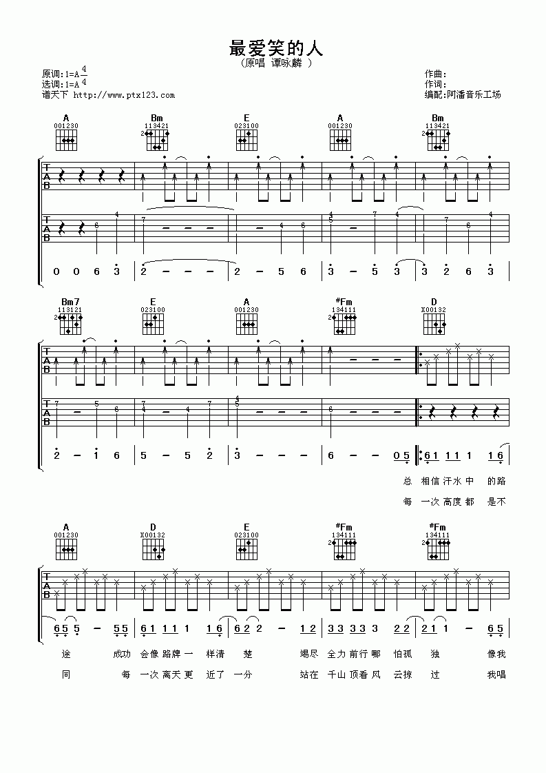 谭咏麟《最爱笑的人》吉他谱,采用10调指法编配,共有3张高清图谱。...