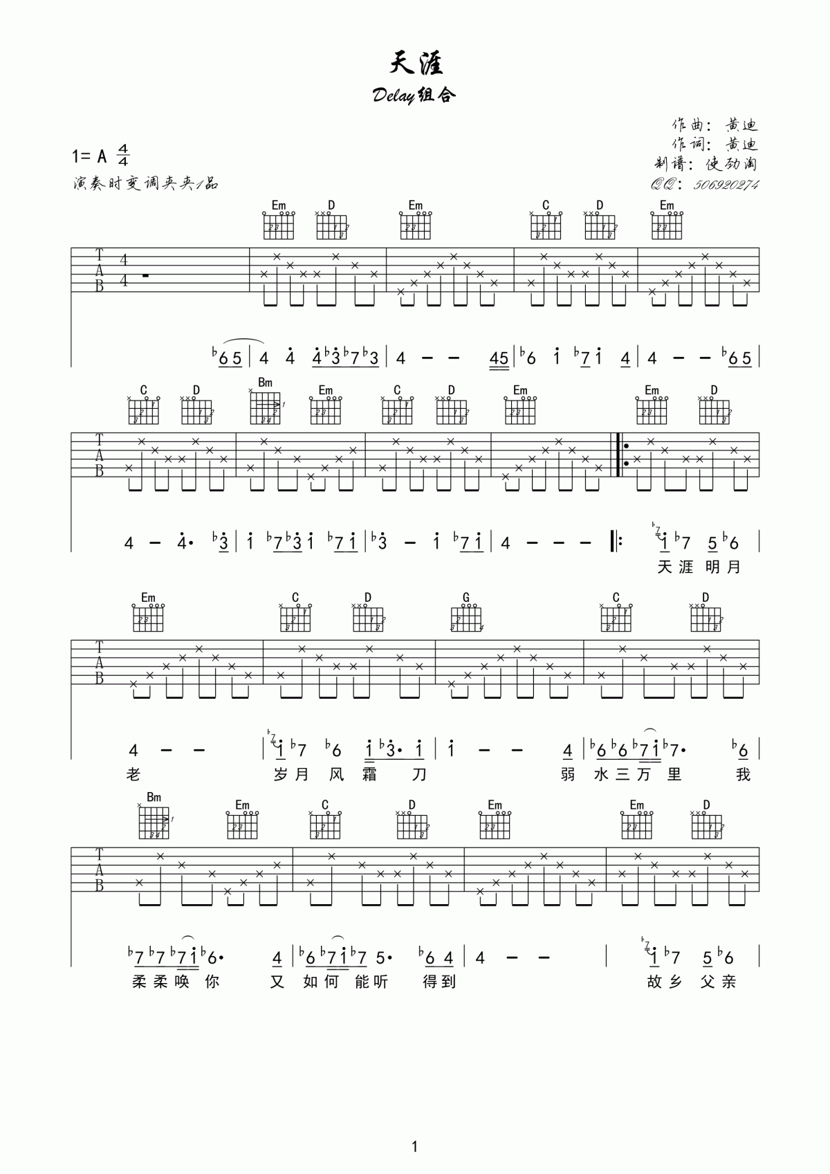 Delay组合《天涯》吉他谱,采用10调指法编配,共有2张高清图谱,免翻页排版设计。...
