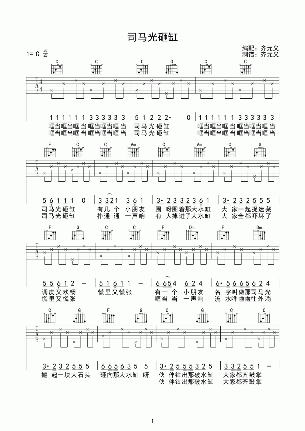 《司马光砸缸》吉他谱,采用C调指法编配,共有2张高清图谱,免翻页排版设计。...